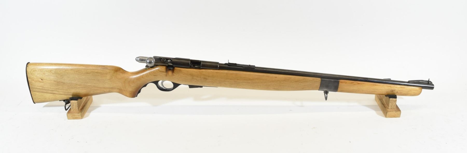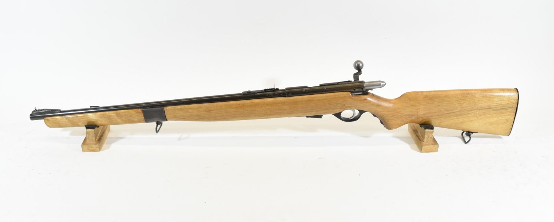 Non-restricted, bolt action, .22 cal. s-l-lr, 23" barrel, SN 3099. Wood is good but has been refinished, bluing is just starting to turn brown in places, bore is excellent, gun were made as training rifles, chip out of rear trigger guard assembly, trigger mechanism not working. properly as bolt will pull right out of gun
