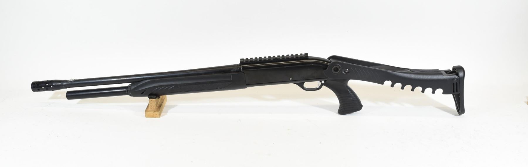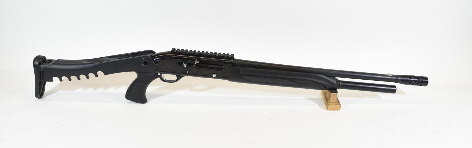 Non-restricted, semi auto action, 12 ga. x 3", 22" barrel with cyl bore choke and compensator, SN 2690. Synthetic folding stock has some scratches and dents, bluing has some scratches and wear marks, bore is pitted. Owner says this is a parts gun.