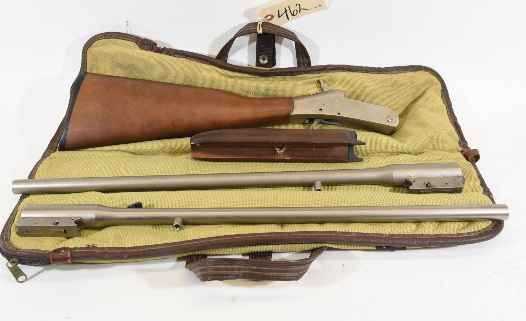 Non-restricted, replaceable barrel, multiple caliber 20 ga. x 3", 22" barrel with mod. choke and 44 Rem Mag 22" barrel, SN AZ512090. Wood is good with few dents, nickel finish is good, bores are good, will not hold cock. Missing trigger guard. Comes with a fabric case.