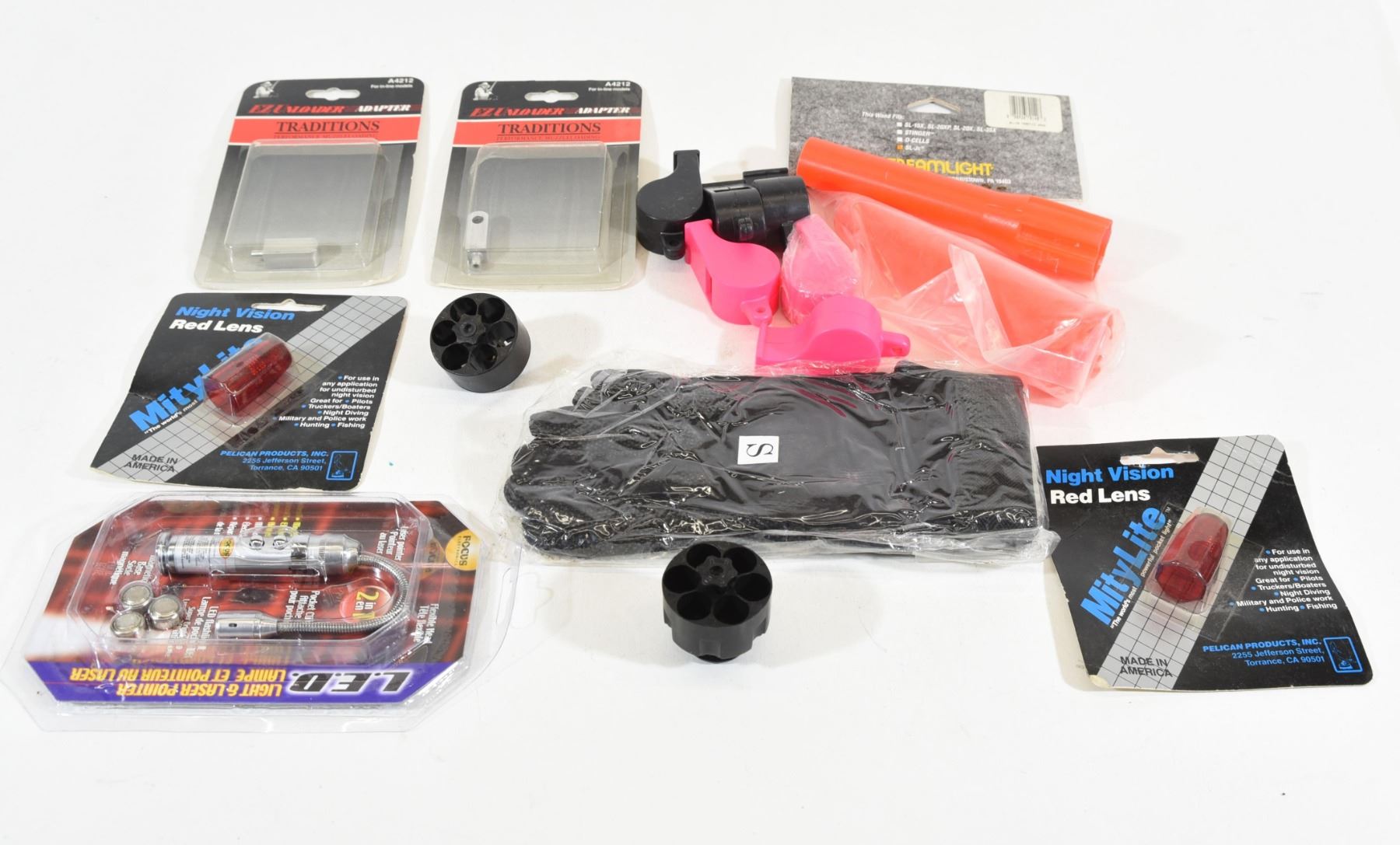 Focus Electronics LED light & laser pointer, two Streamlight traffic wands, size small gloves, two Night Vision red lens, three pink whistles, three black whistles, two speed loaders, two Traditions A4212 in line adapter.
