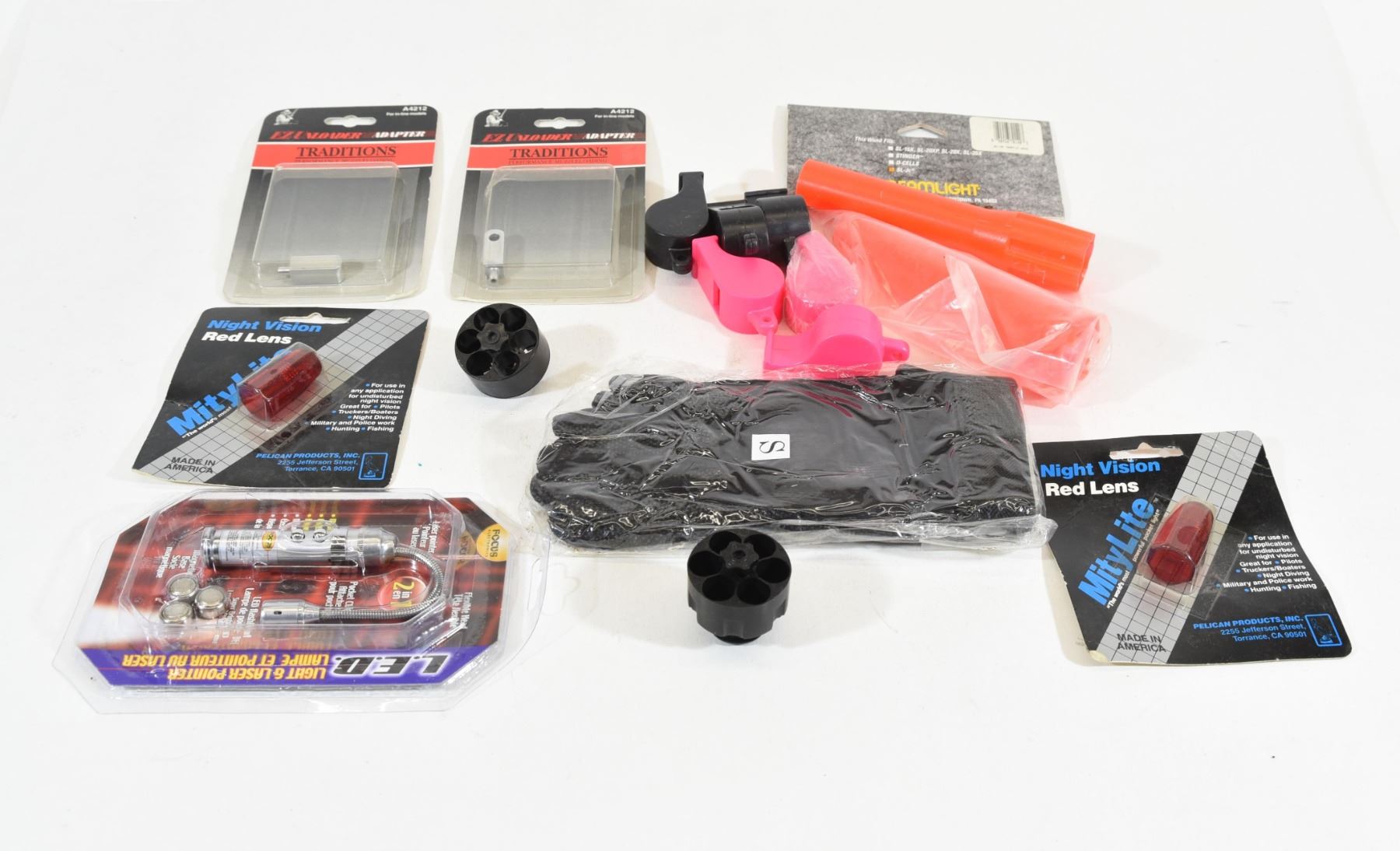 Focus Electronics LED light & laser pointer, two Streamlight traffic wands, size small gloves, two Night Vision red lens, three pink whistles, three black whistles, two speed loaders, two Traditions A4212 in line adapter.