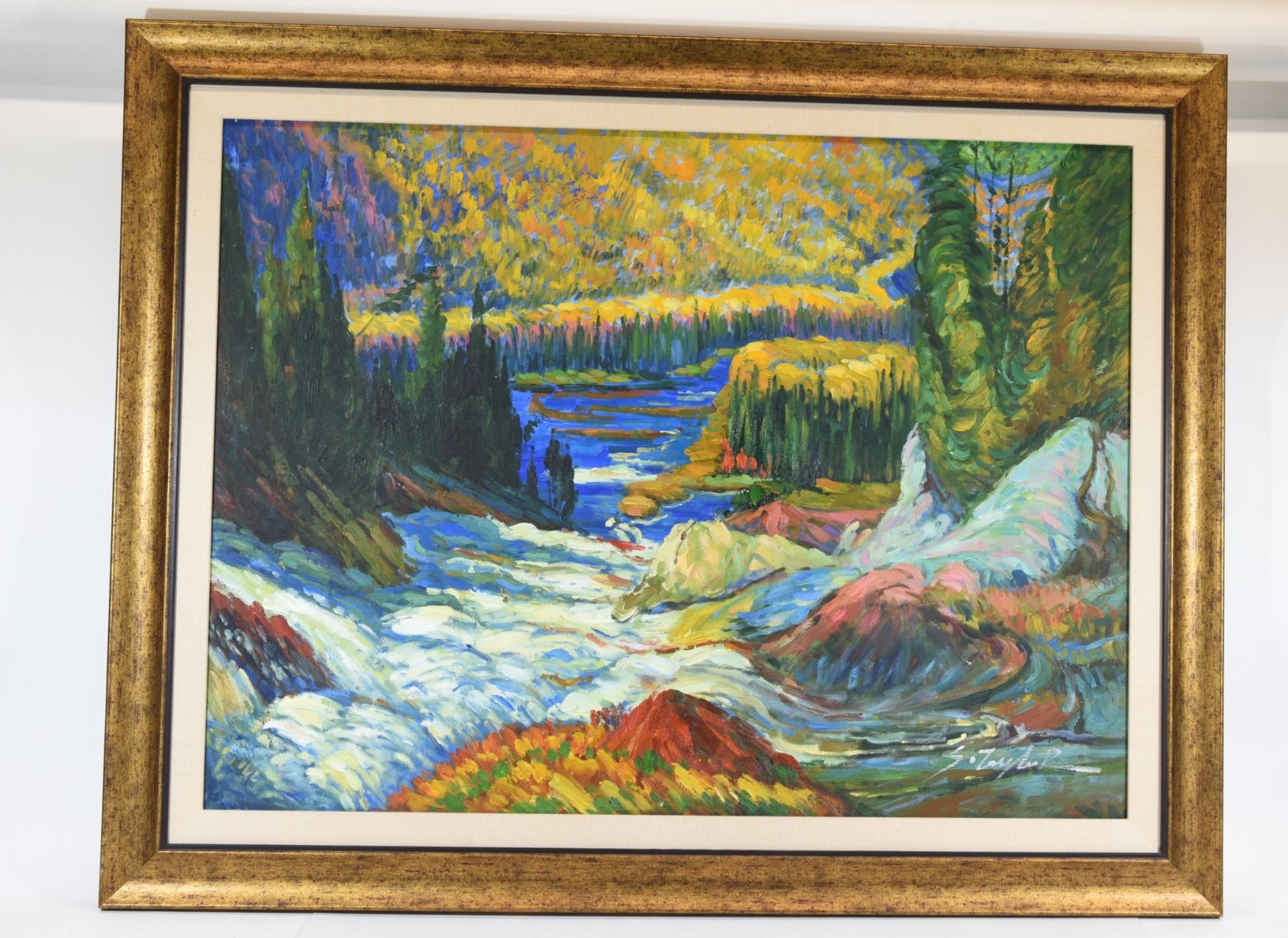River & Mountains by S. Taylor. 38 x 30 inches.