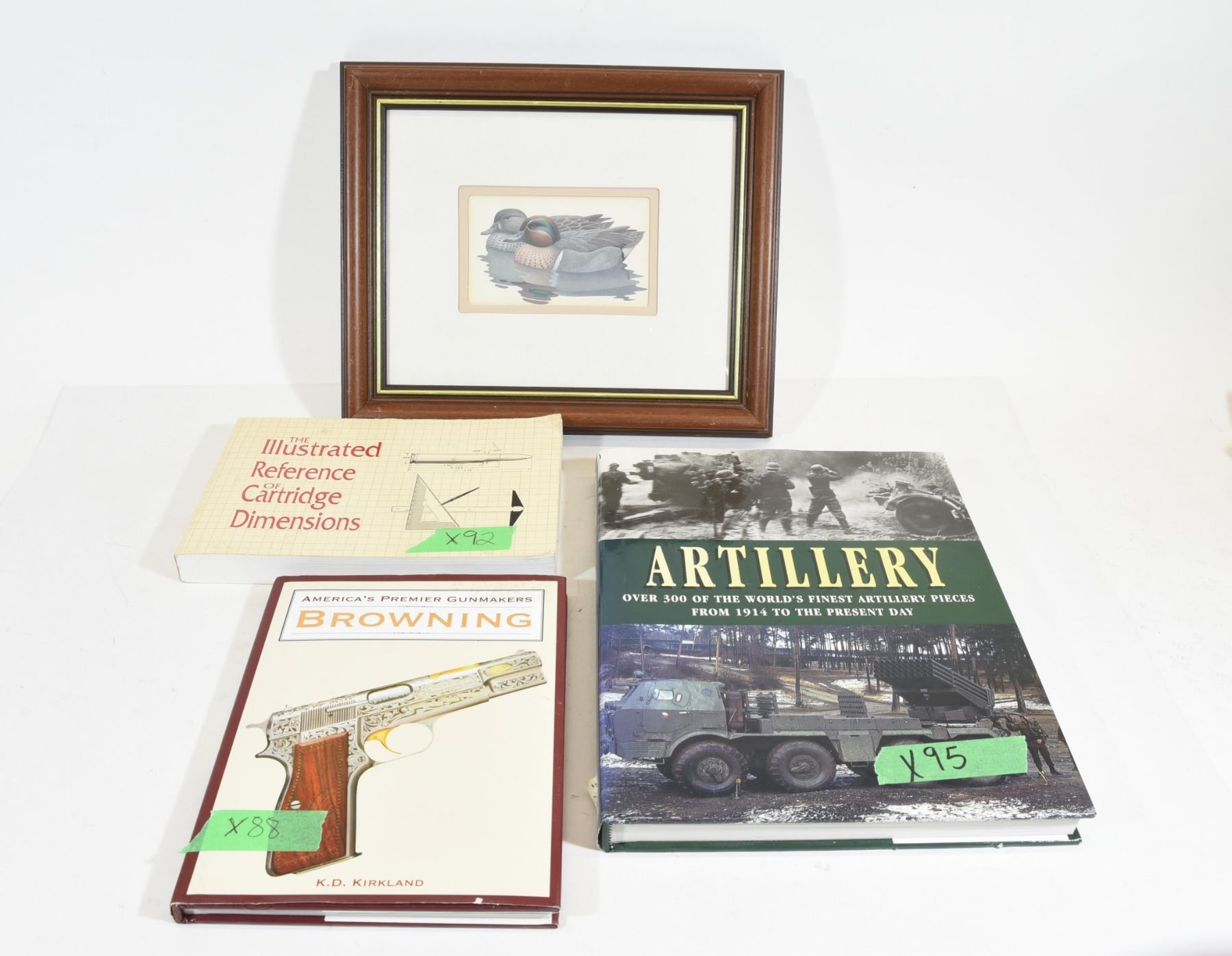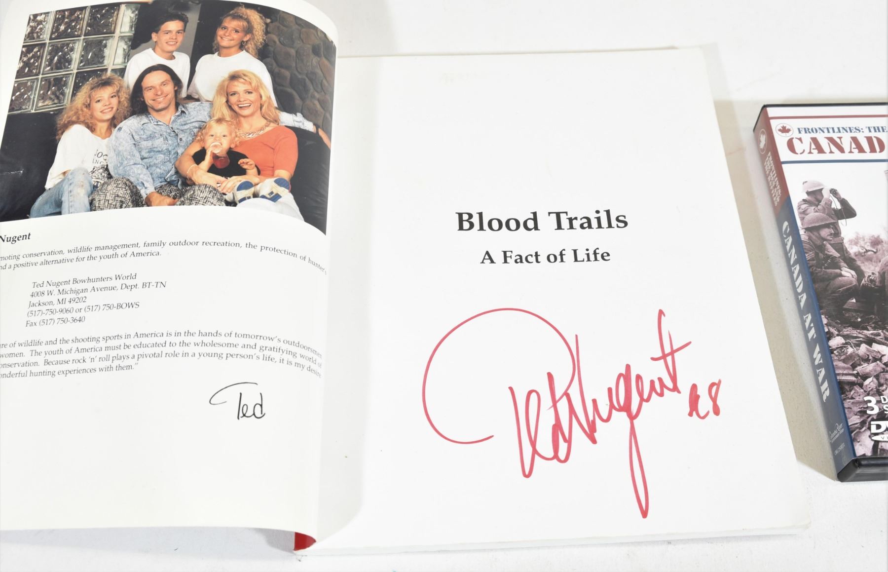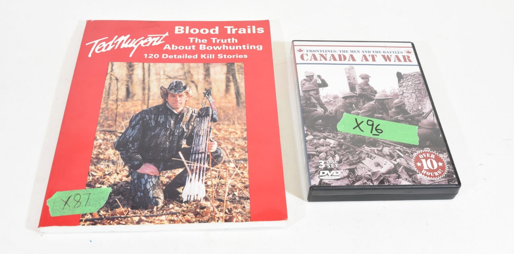 Artillery, Ted Nugent autographed Blood Trails, Browning, Cartridge Dimensions, Canada at War 3 DVD set. Framed copy of wood ducks.