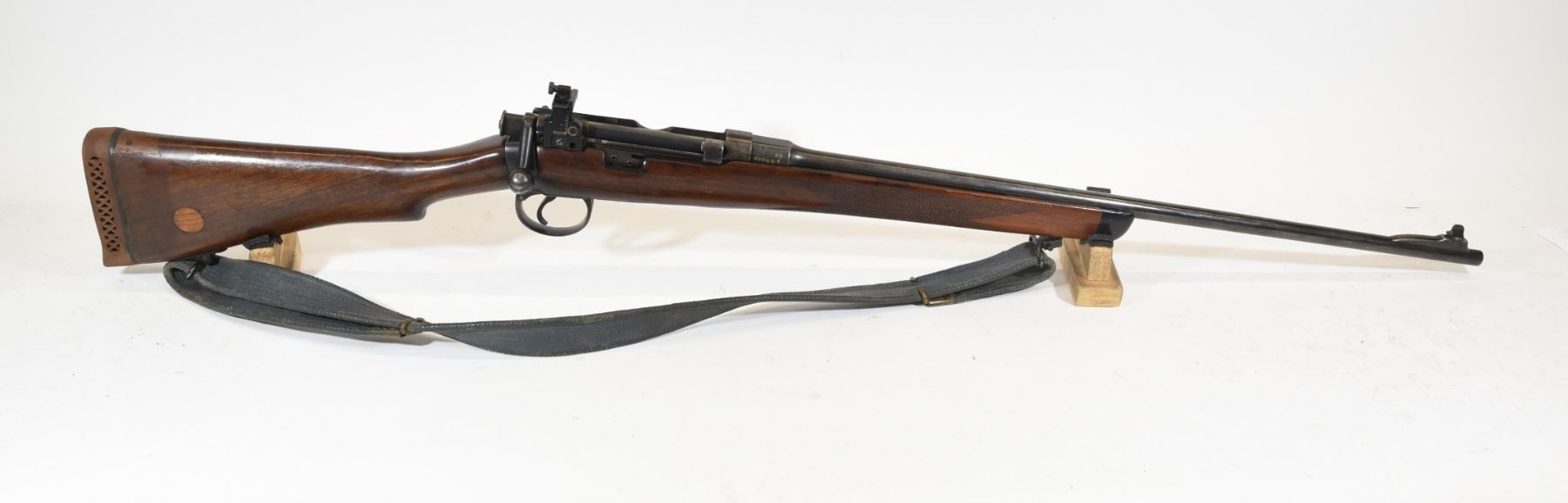 Non-restricted, single shot, 22 Hornet, 25" barrel, SN X13379. Sporter wood has scratches, marks and dents, bluing is grey with pitting on barrel, bore very good. No floor plate, Williams rear peep. Bolt falls out easily.