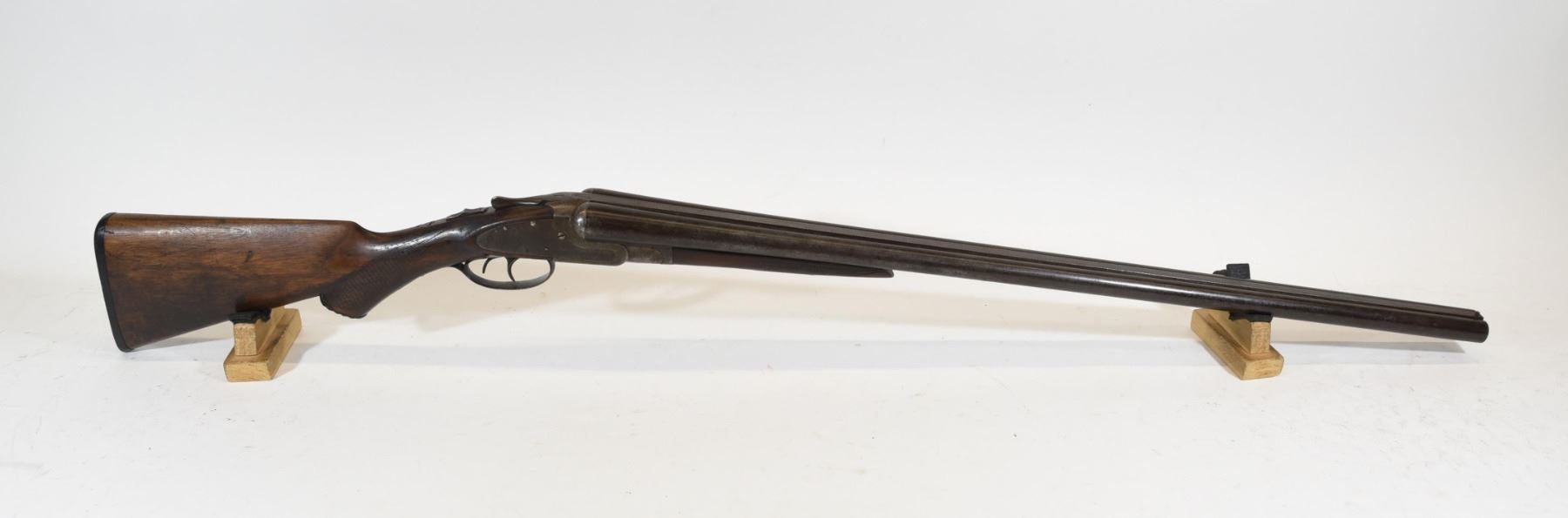 Non-restricted, multi barrel, 12 Ga x 2 3/4", 30" barrels with fixed chokes (F,M), SN 34033. Wood has scratches, marks and dent, bluing is brown, bores pitted.