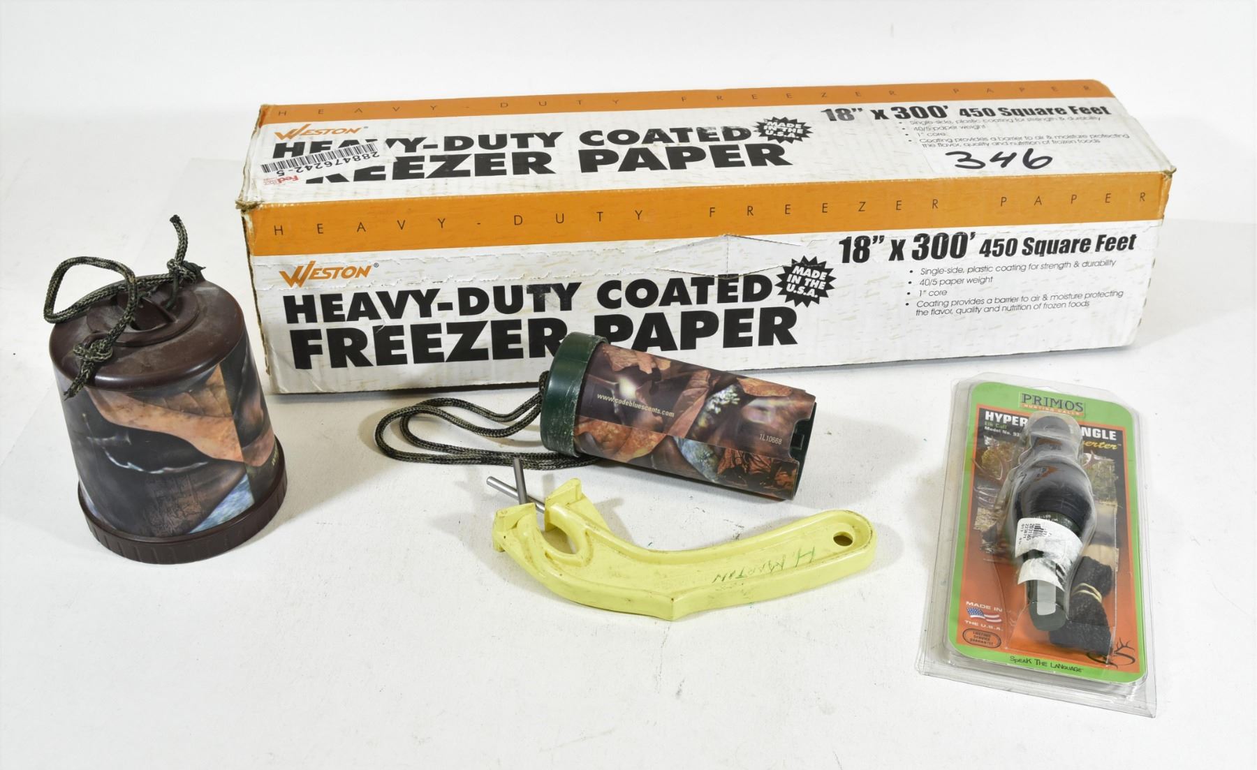 1) Primos hyper lip single elk call model no. 933 2) Code Blue scent dispenser, unknown functionality 3) Code Blue scent dispenser, unknown functionality 4) Edgemaker knife sharpener 5) Roll of Weston heavy duty coated freezer paper, 18" x 300'