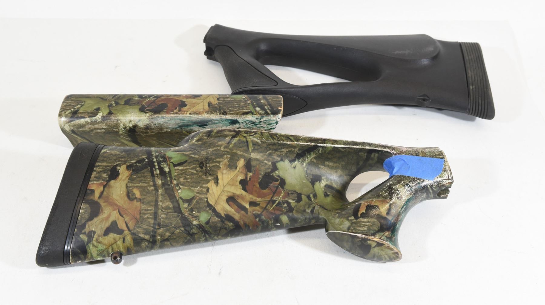 1) Remington 870 thumbhole stock and fore-end, camo and in fair condition with some wear 2) Remington 870 sureshot rear stock only, black synthetic in good condition