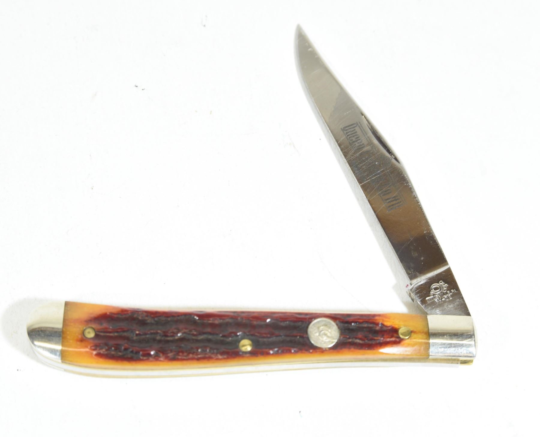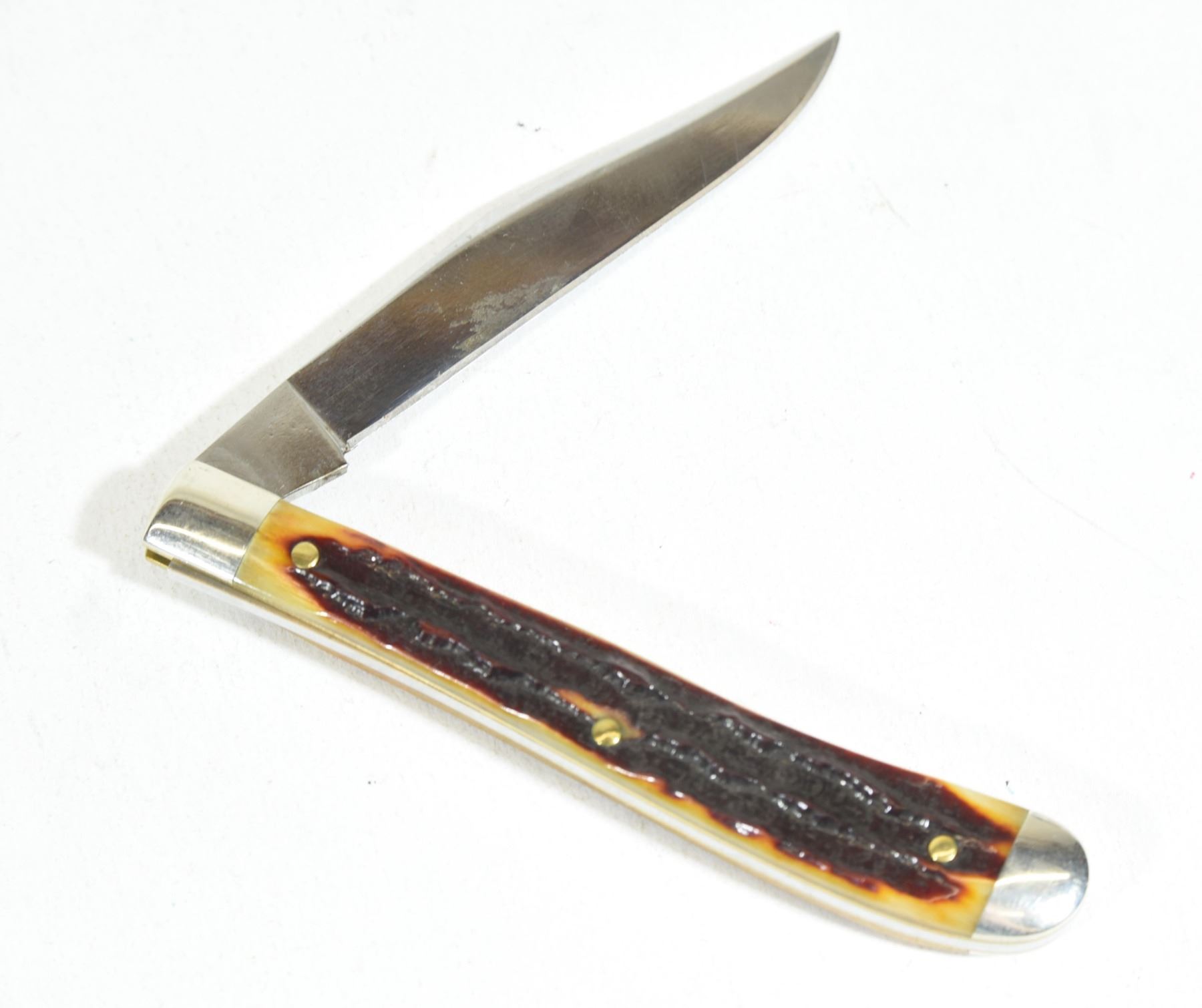 Amber cut stag bone handles, 3" D2 steel blade, 4" when closed, blade has been sharpened with scratches on blade, no box