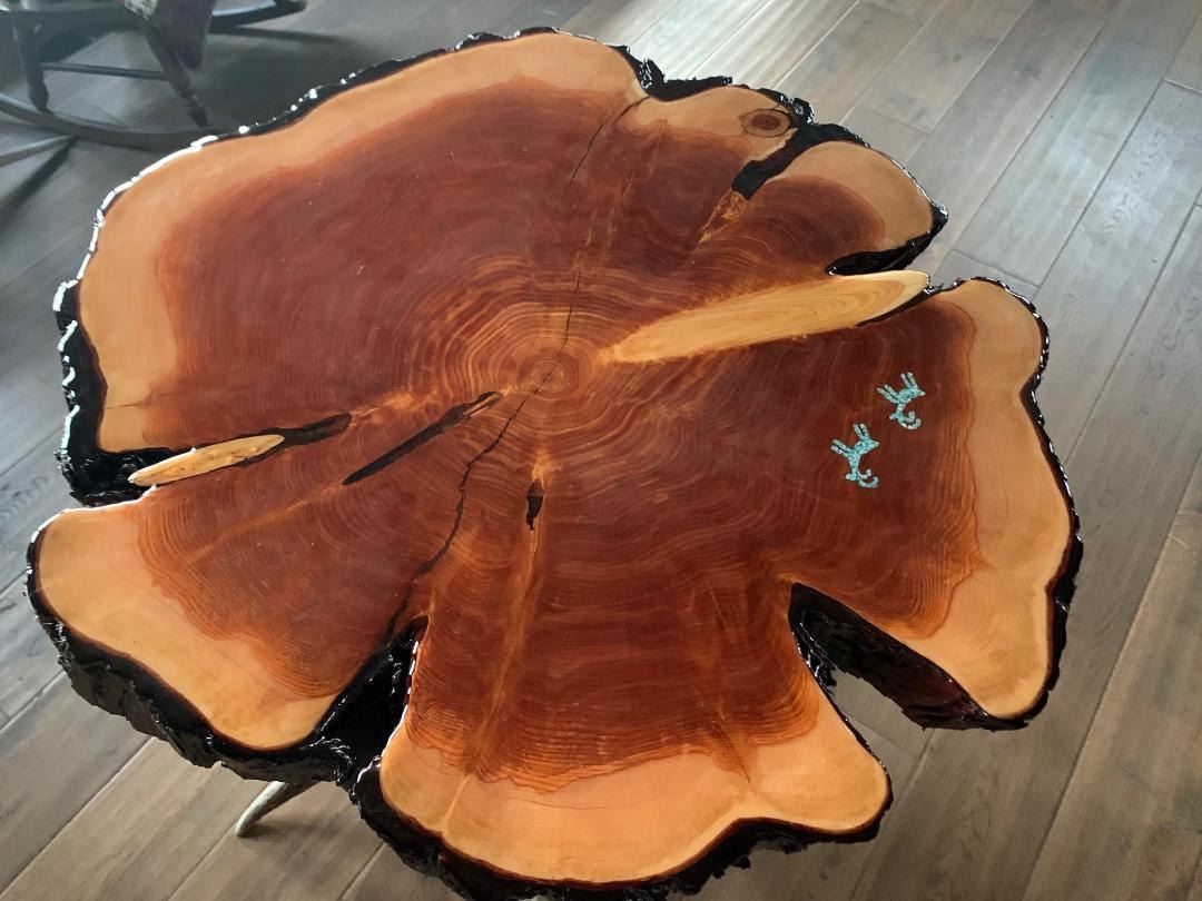 DONATION: You don’t want to miss the opportunity to bid on this one-of-a-kind high top bar table. It is 36" high (standard bar top height). with turquoise inlay in the top and one antler. WSF logo in another antler. The base is put together with antlers from Larry Jacobs and ODFW in a fashion to show off the beauty of antler art. The wood is from an OR-FNAWS Juniper cut project.