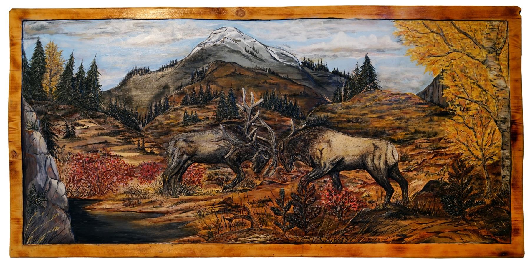 DONATION: This wooden scene is a true piece of art. Several panels of wood were used to create elk sparing in the wild. Enjoy this beautiful art in your home or lodge.