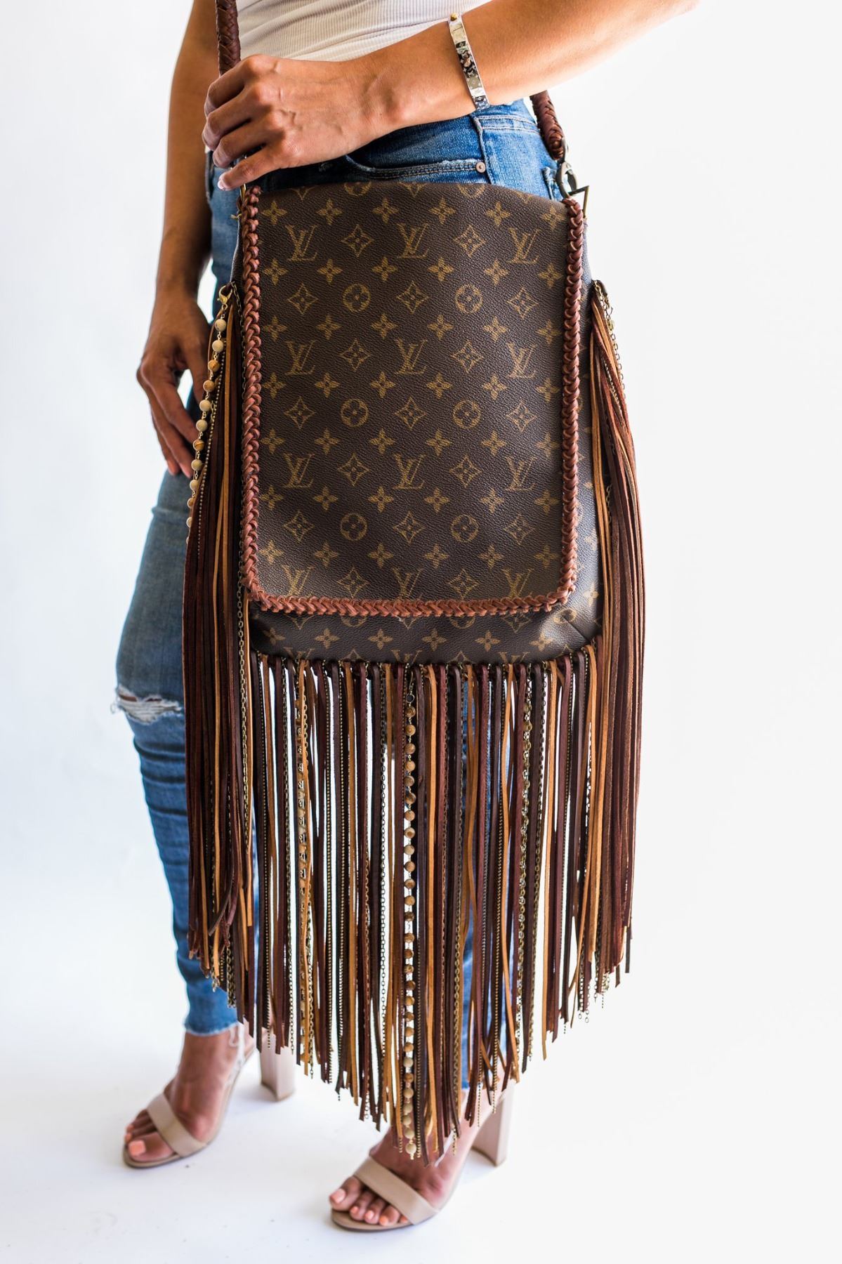 Vintage Boho creates the “Barcelona” by sourcing authentic, used Louis Vuitton Musette bags. Vintage Boho conditions the leather, replaces any straps or any part showing prominent wear, and adds dramatic fringe and embellishments. Each bag is unique and the condition will slightly vary due to its vintage nature.