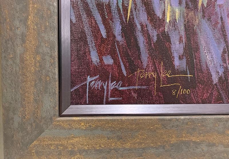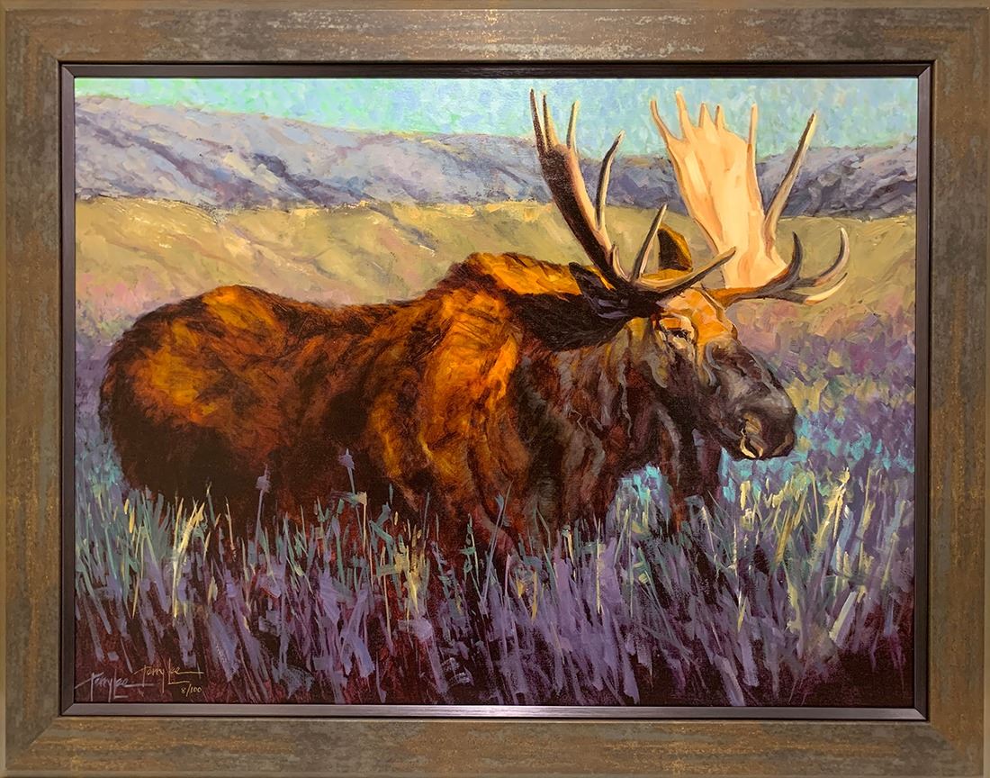 This comparison comes as a great compliment to Lee, as one of his most admired artists, Matisse was regarded as the movements leading figure. Lee’s trademark giant canvases and bold color encapsulate his unique style as a contemporary and impressionistic artist. His form of realism is easily recognized and appreciated by his collectors. His equal prowess as a sculptor makes him a formidable force in today’s art world. We are offering Lee’s extraordinary “Moose Flats” signed and numbered limited edition giclée (number 8 of 100) with a canvas size of 23x31 inches. Flawlessly framed in a 3” beveled wood frame (29x37 inches) with a look of Metallic, pulling the grays and browns perfectly from the painting, lined with a gray metallic liner that picks up the wonderful rich purples of the painting. This extraordinary work of art will make a beautiful addition to a modern or traditional home.