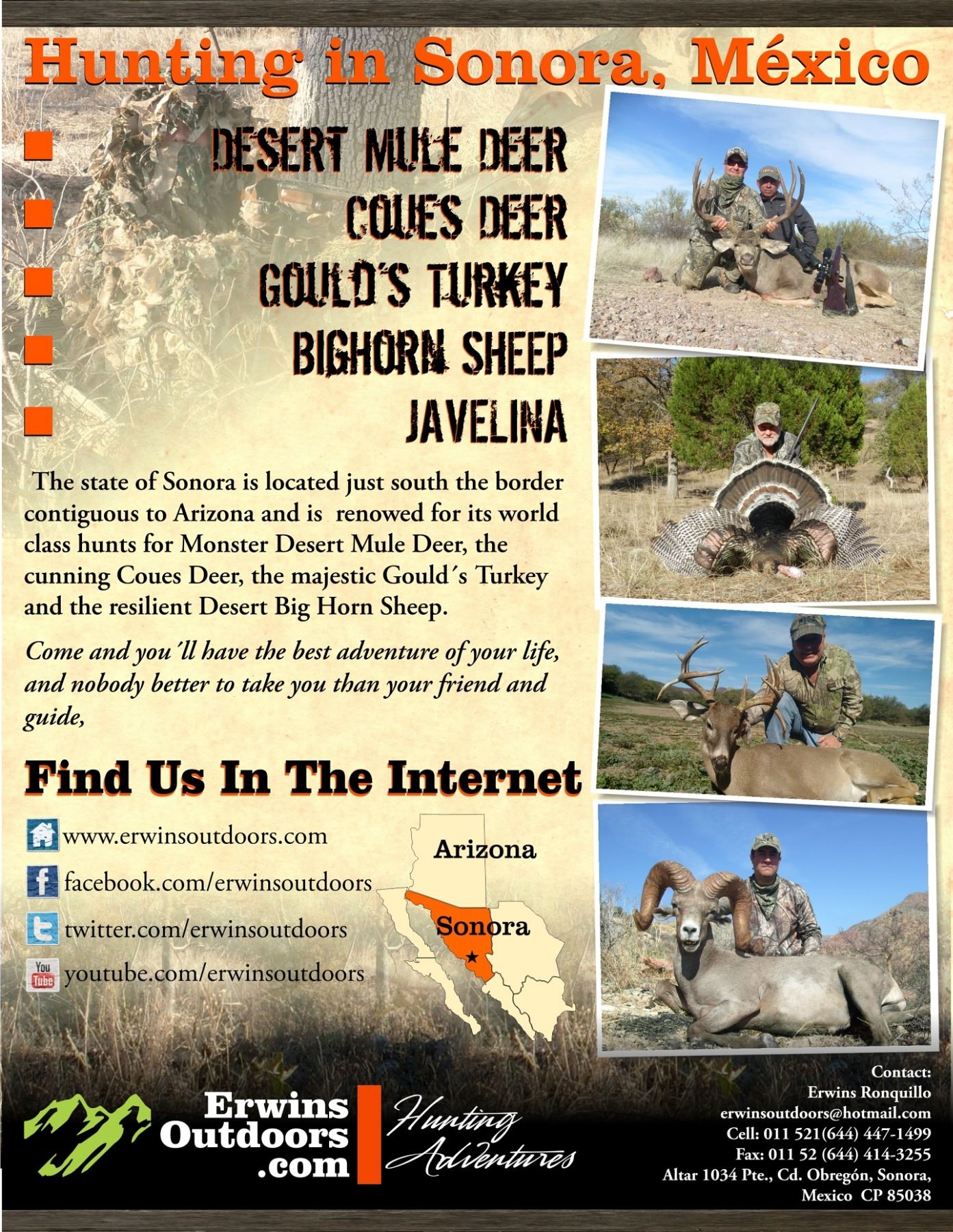 Erwins Ronquillo owner of Erwins Outdoors has again generously provided this Mexico adventure for Coues Deer. Two hunters will travel to Hermosillo Mexico to hunt “The Great Ghost” six (6) hunting days in January of 2021 or 2022 (the very best time for Coues Deer).