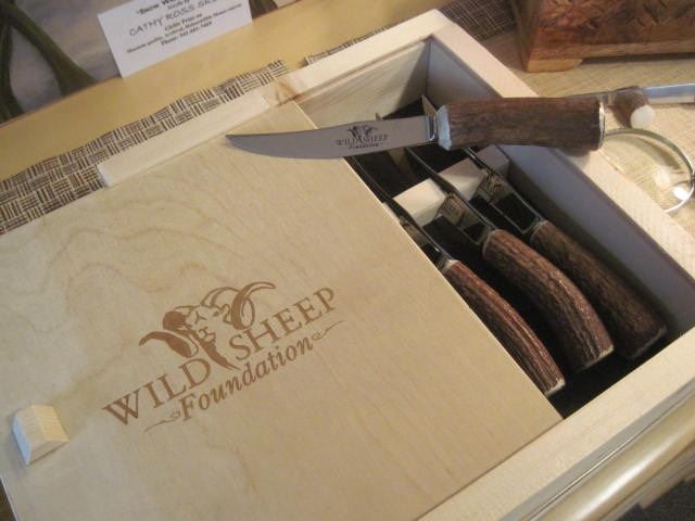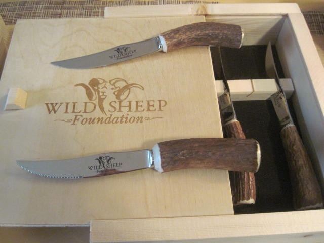 Description: Set of Six forged stainless stell steak knives in a wooden box. The Wild Sheep Foundation logo is engraved on the blades and the box lid. The handles are made from elk antler tines with polished nickle silver end caps.