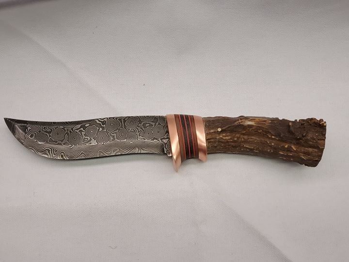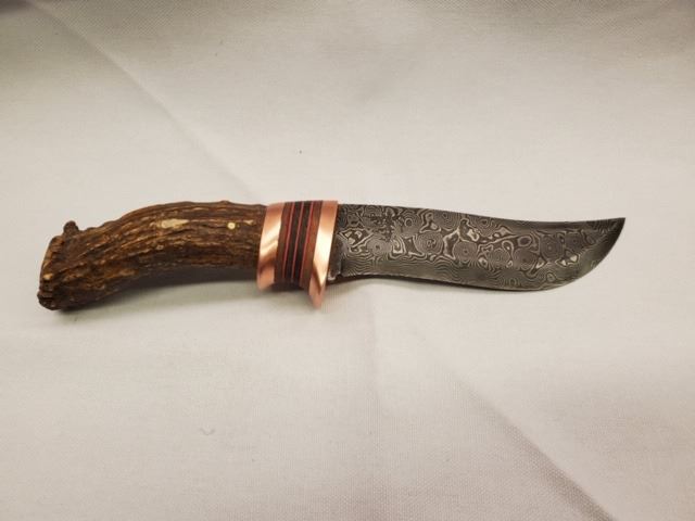 This blade is Damascus design made from a recycled bandsaw blade (1095 steel) and metal pallet strapping (5160 steel). These two were layered up and forge welded. They were then drilled and hammered out to produce the raindrop pattern. The copper in the handle is from a buzzbar in an industrial electrical panel. The main portion of the handle is deer antler accented with leather and layered red G10 and secured with epoxy and a brass pin.
