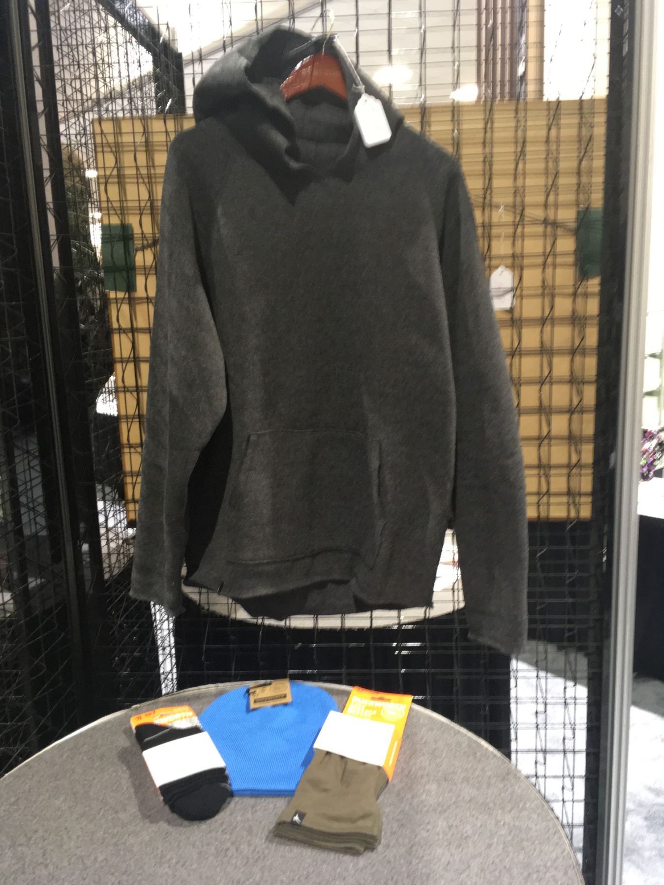 Description: Men's Large Wool Hoodie, Beanie, and Lightweight med crew socks. A versatile, loose fit, multi-functional fleece hoody with pouch pocket. This wool fleece is engineered for comfort, insulation, and wicking. The tough wool outer matrix is stealthy and light with a soft brushed inside against the skin. Made from source-verified Montana-grown merino wool