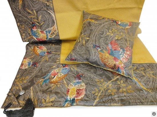 High end tablecloth and pillow pair by Altalena of Geneva Switzerland. Pillows are feather filled and fabric is 100% cotton. A beautiful accent piece to any trophy room. If you buy this set retail, you'd pay $900. Very high end decor!