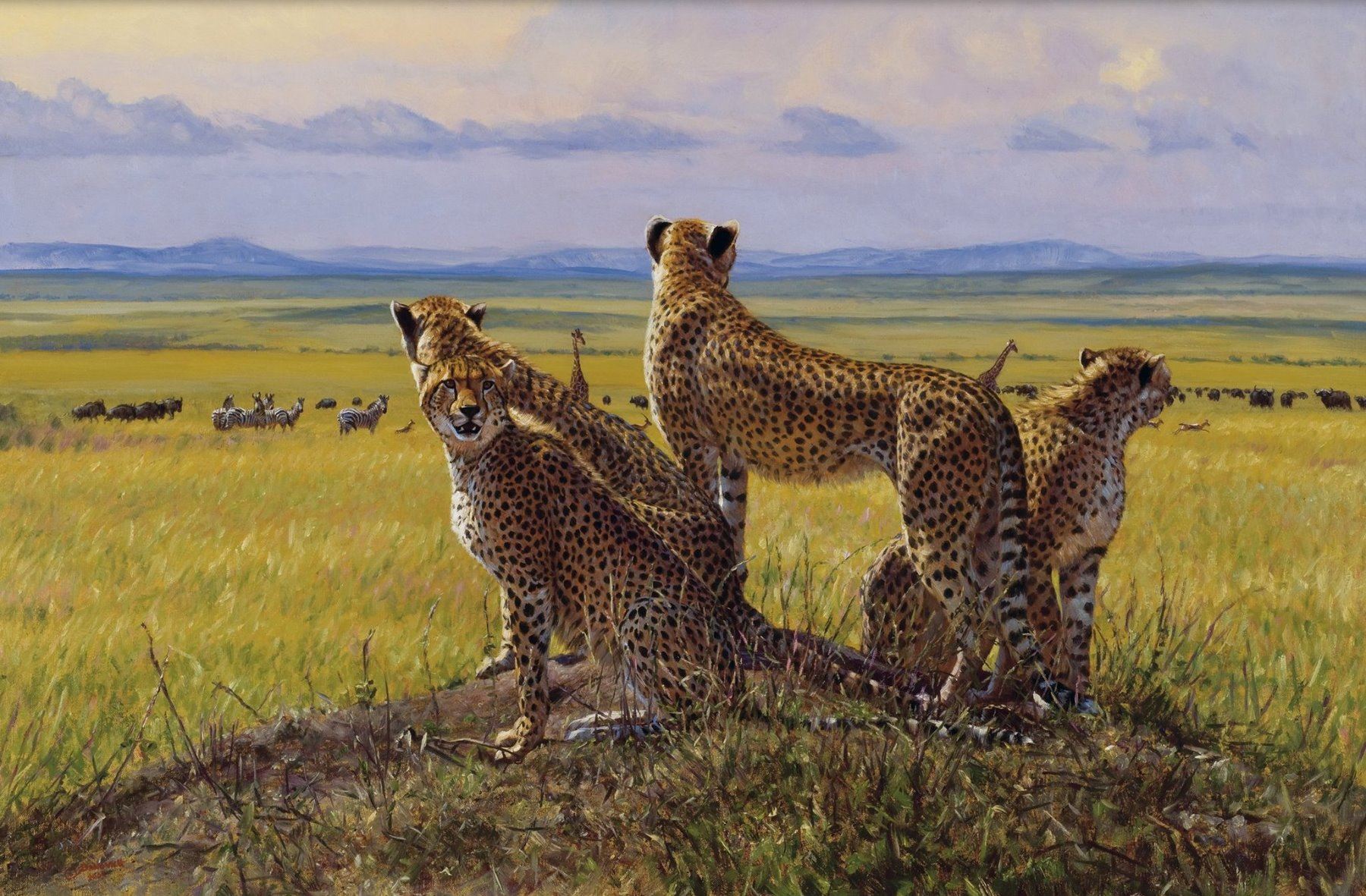 This Limited Edition 20” x 30” Giclee depicts a pride of Cheetahs, perched on a hill, intensely watching the herds of wildebeest in the distance. The Serengeti is a vast ecosystem and harbors one of the largest migrations on earth, the great wildebeest migration. It is awe-inspiring to witness and has been going on for millions of years-ad infinitum.