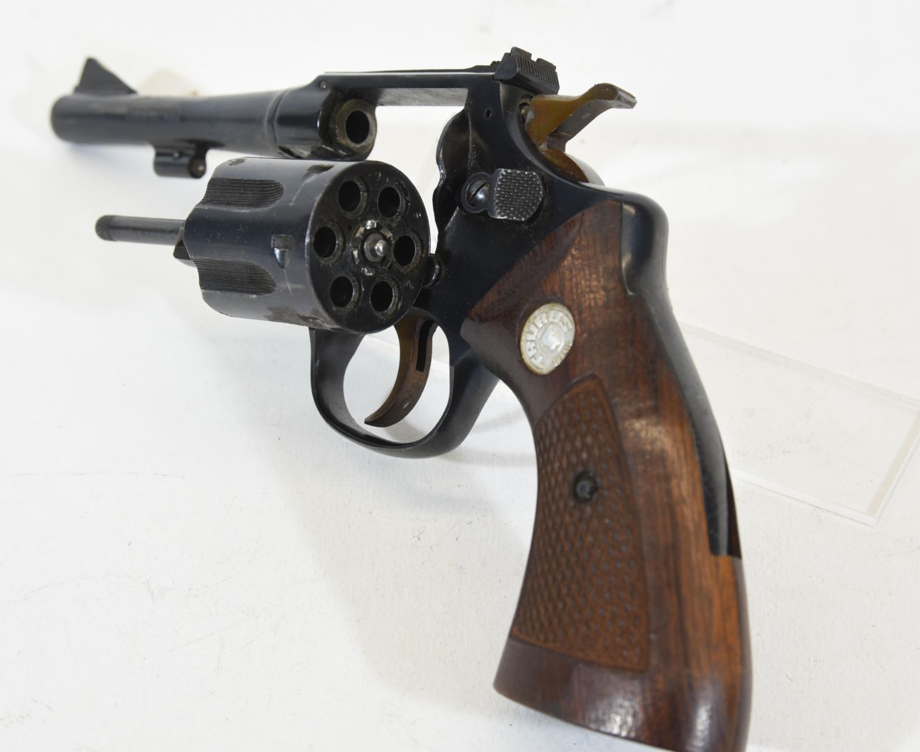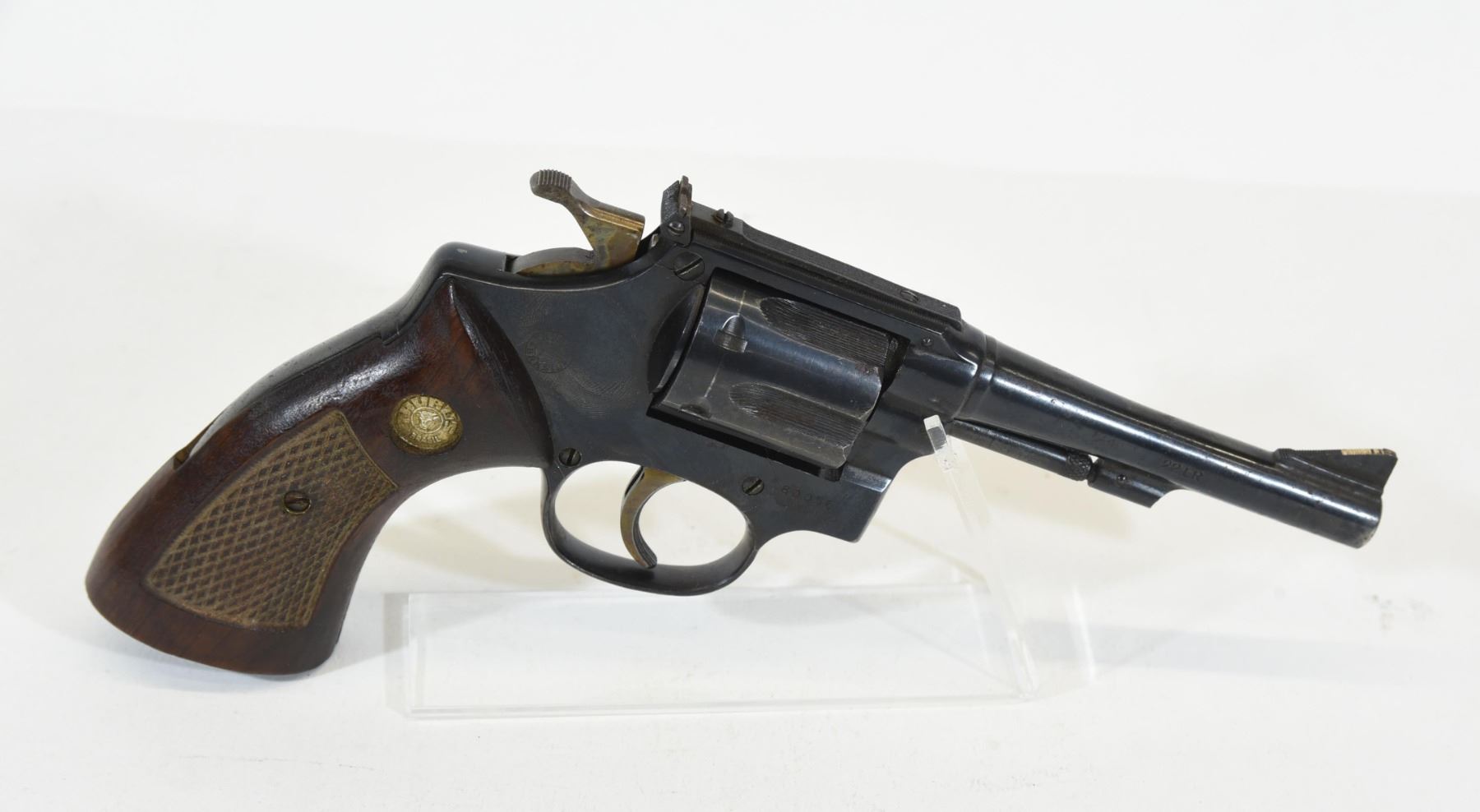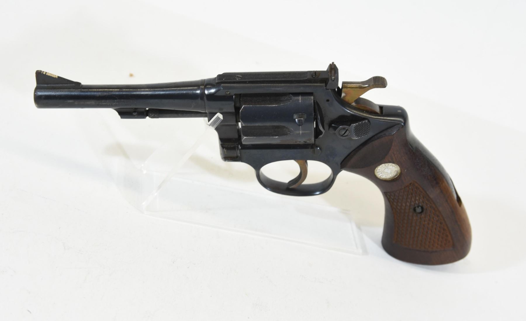 Prohibited, revolver, 22 LR, 102mm barrel, SN 80056. Wood grips have one scratch, bluing rusty on cylinder with light pitting all over, bore excellent.