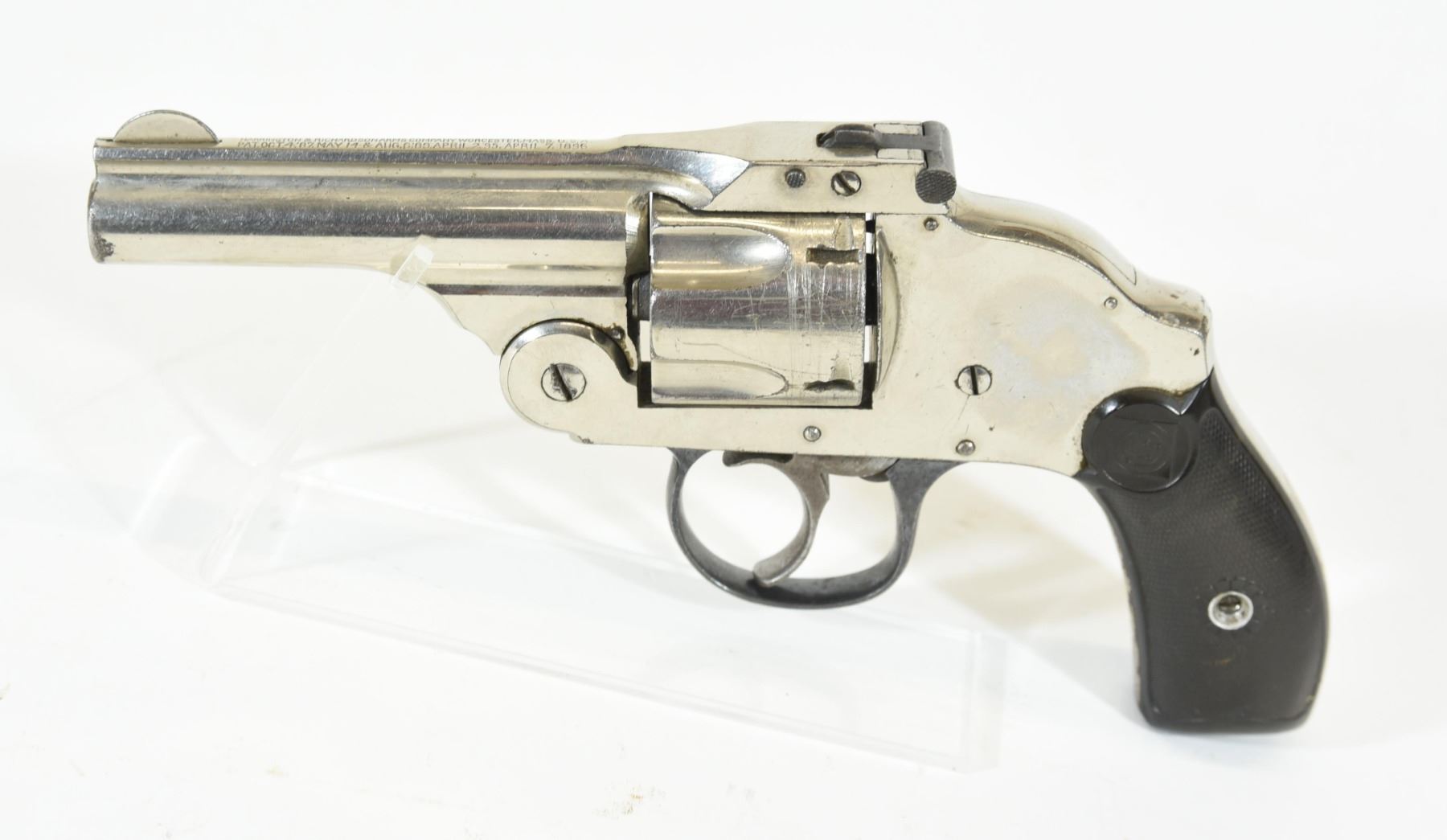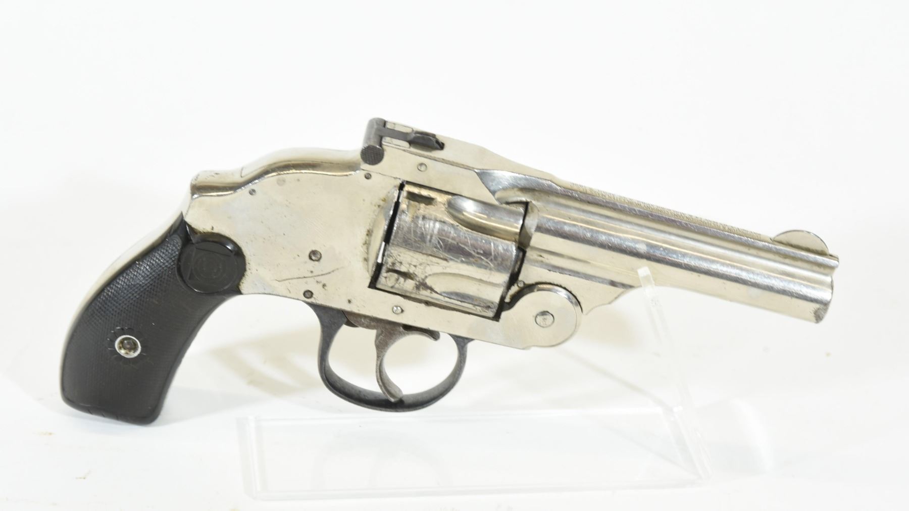 Prohibited, revolver, 38 S&W, 83mm barrel, SN 16443. Grips have some wear and scratches, nickel plating has numerous scratches, bore pitted.
