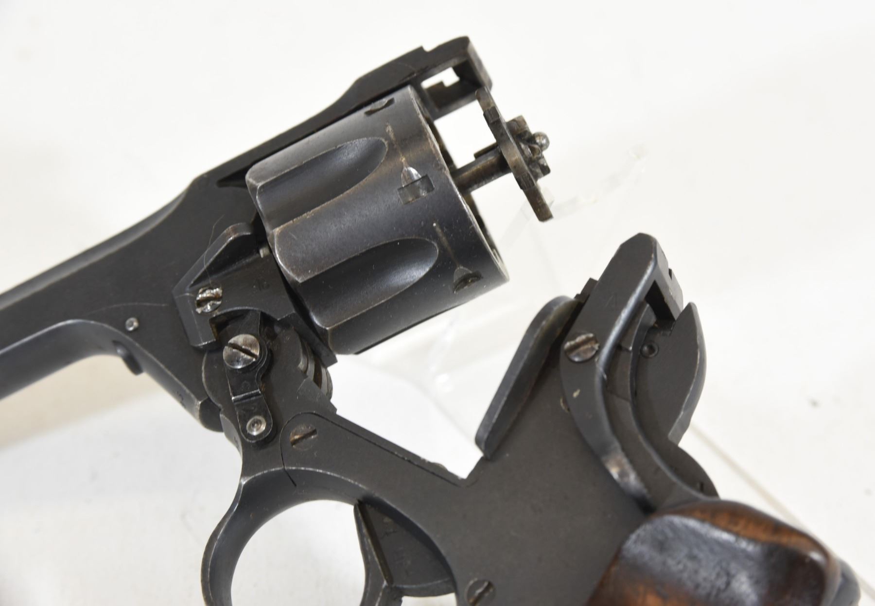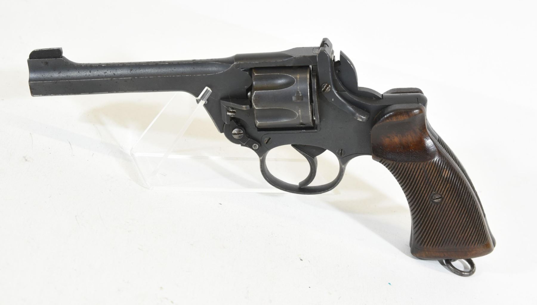 Restricted, revolver, 38 S&W, 127mm barrel, SN J5695. Wood grips have small dents, bluing faded with numerous pit marks, bore excellent. Dated 1940.