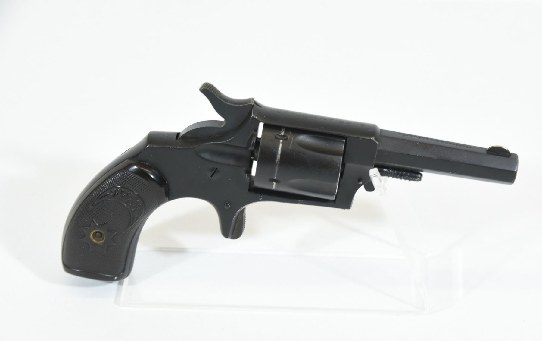 Antique, revolver, 32 RF, 65mm barrel, SN 19900. Plastic grips excellent, bluing spray painted black, bore has pitting, rifling evident. Cylinder turns and trigger fires.
