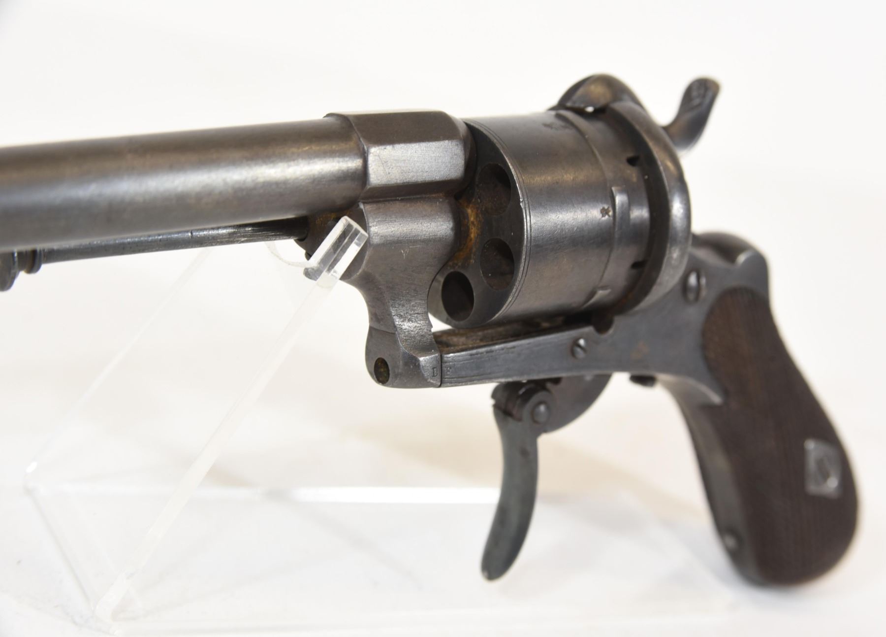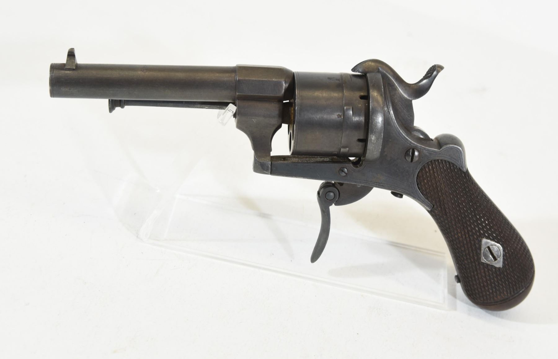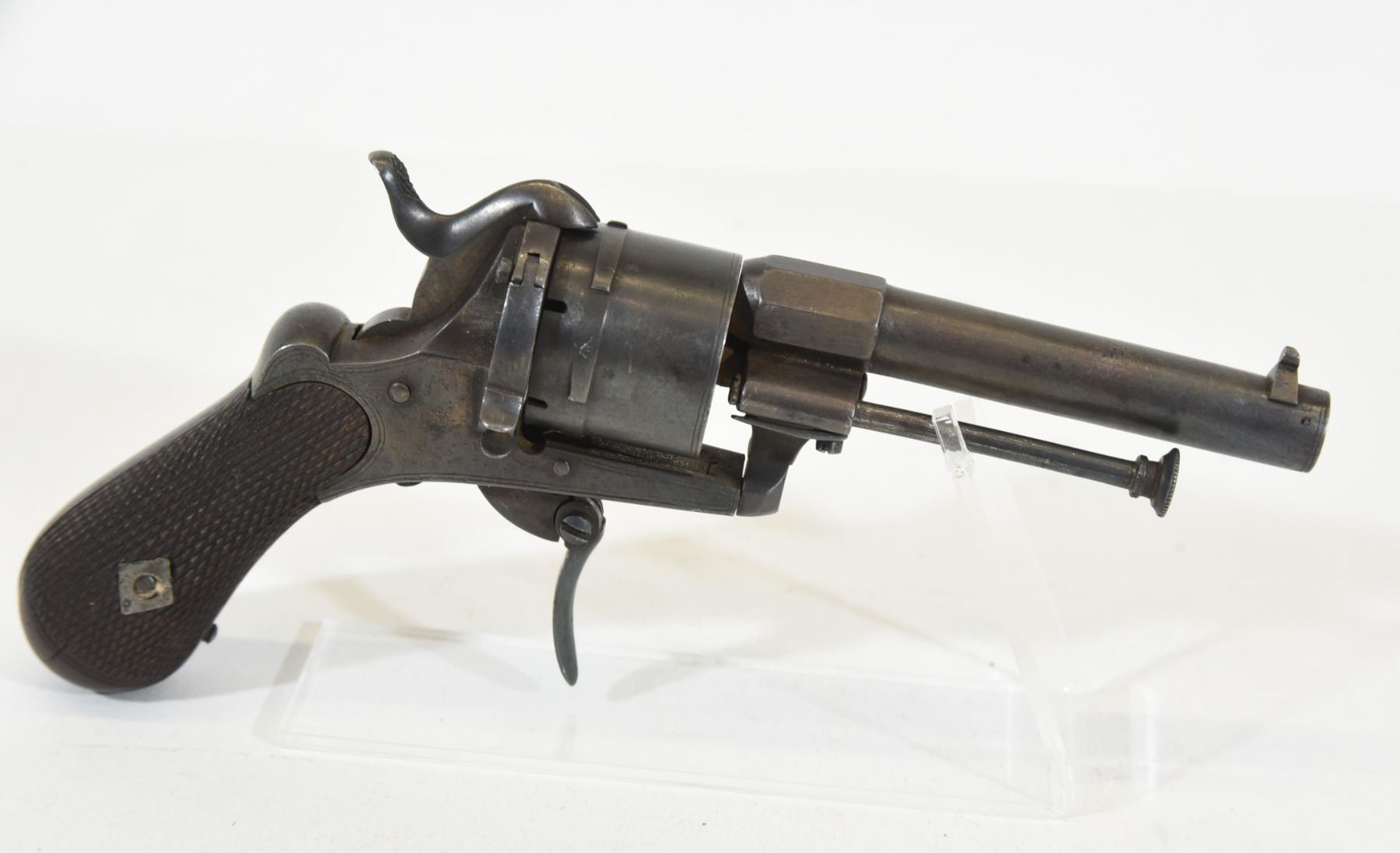 Antique, revolver, 7mm pinfire, 87mm barrel, SN 10169. Wood grips have a scratch, bluing is grey, bore has pitting.