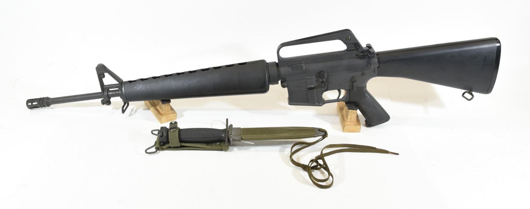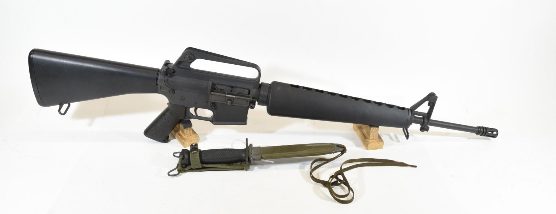 Restricted, semi-auto, .223 caliber, 20" barrel, SN SP 160807, synthetic stock is in good condition, bluing is matte and in good condition, bore is very good. Comes with bayonet and sheath.