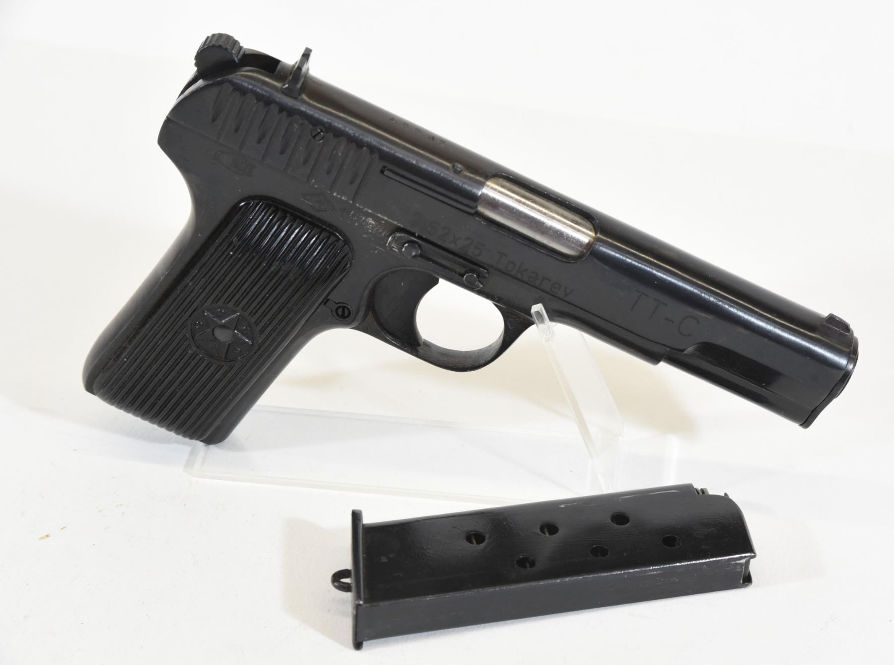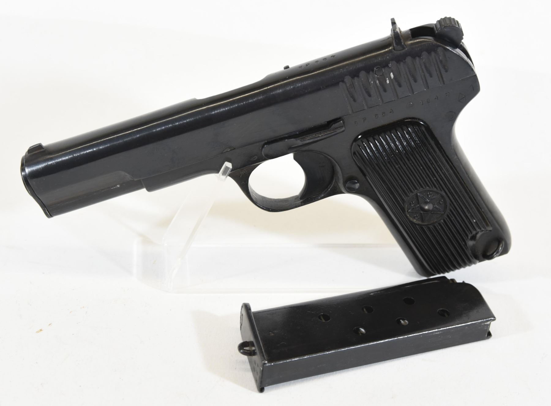 Restricted, semi-auto, 7.62 x 25, 115mm barrel, SN BP664. Plastic grips have some marks, bluing good, bore excellent.