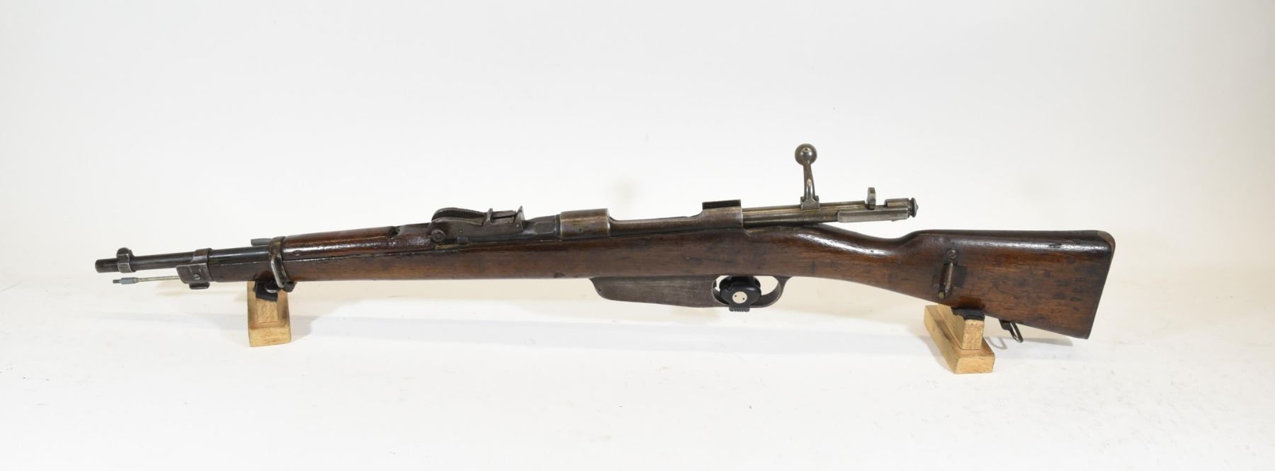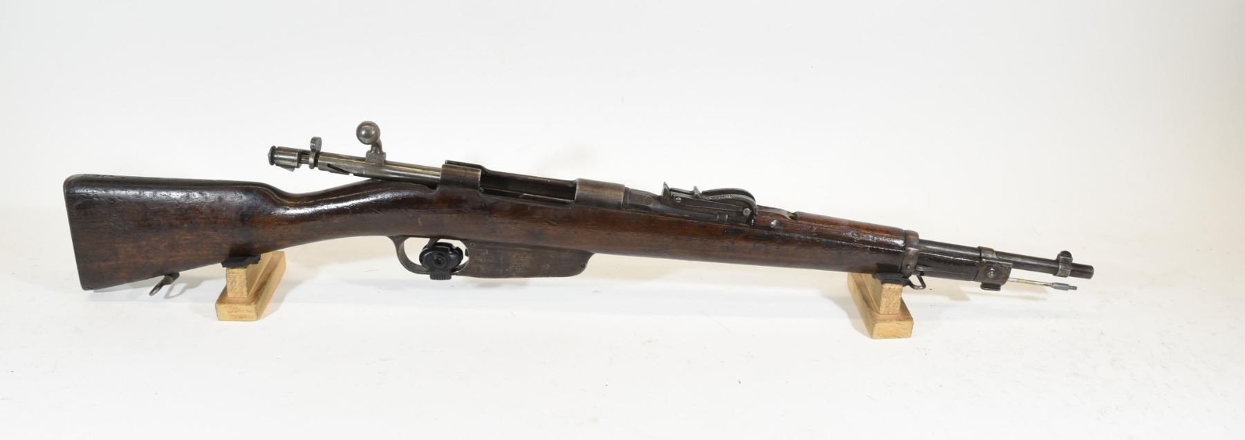 Non-restricted, bolt action, 6.5 x 52, 18" barrel, SN M723. Wood has numerous dents, gouges, and marks, bluing turning brown, bore good.
