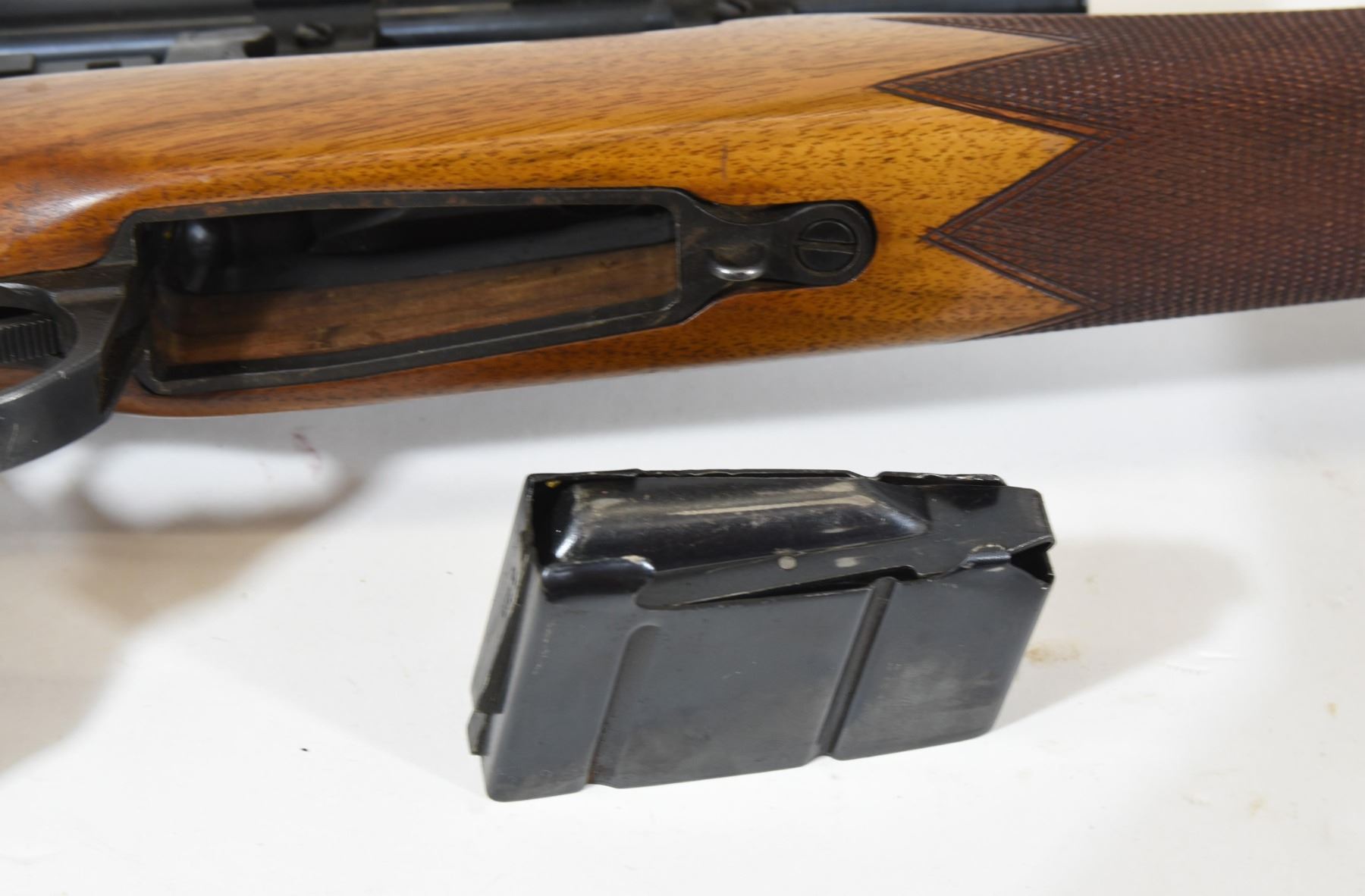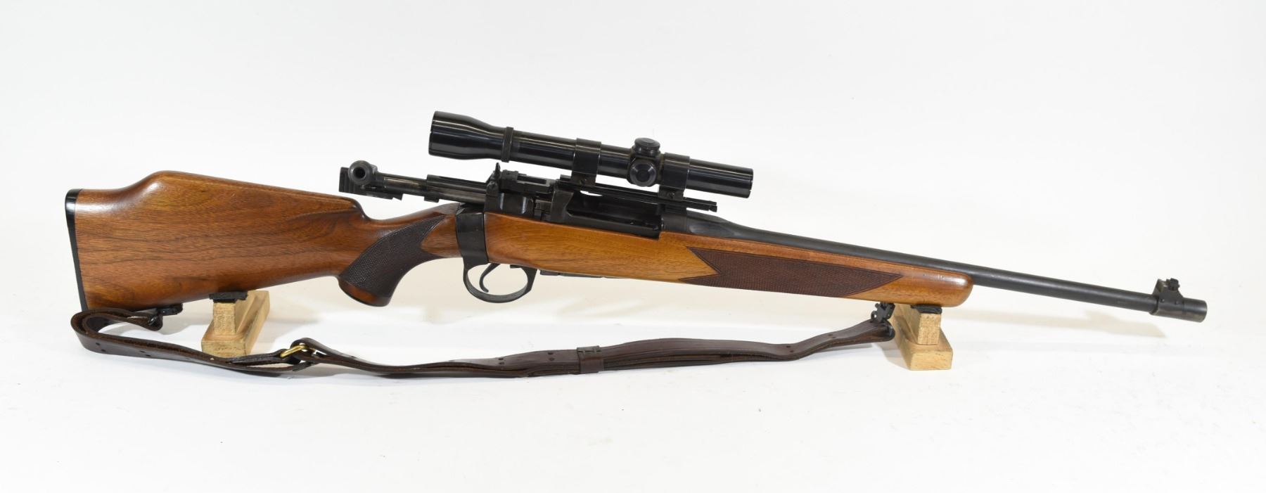Non-restricted, bolt action, 303 British, 19" barrel, SN none. Wood has normal handling marks some dents, bluing is good with wear at muzzle, bore good. Glass is clear in Weaver fixed length scope.