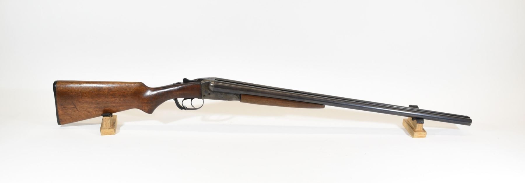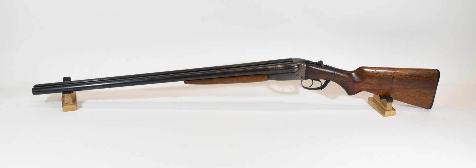 Non-restricted, multi-barrel, 12 Ga x 2 3/4", 28" barrels with fixed chokes (F,M), SN none. Wood has two cracks behind receiver, bluing is grey with some bare patches, receiver showing little case hardening, bores excellent. Trigger guard cracked.