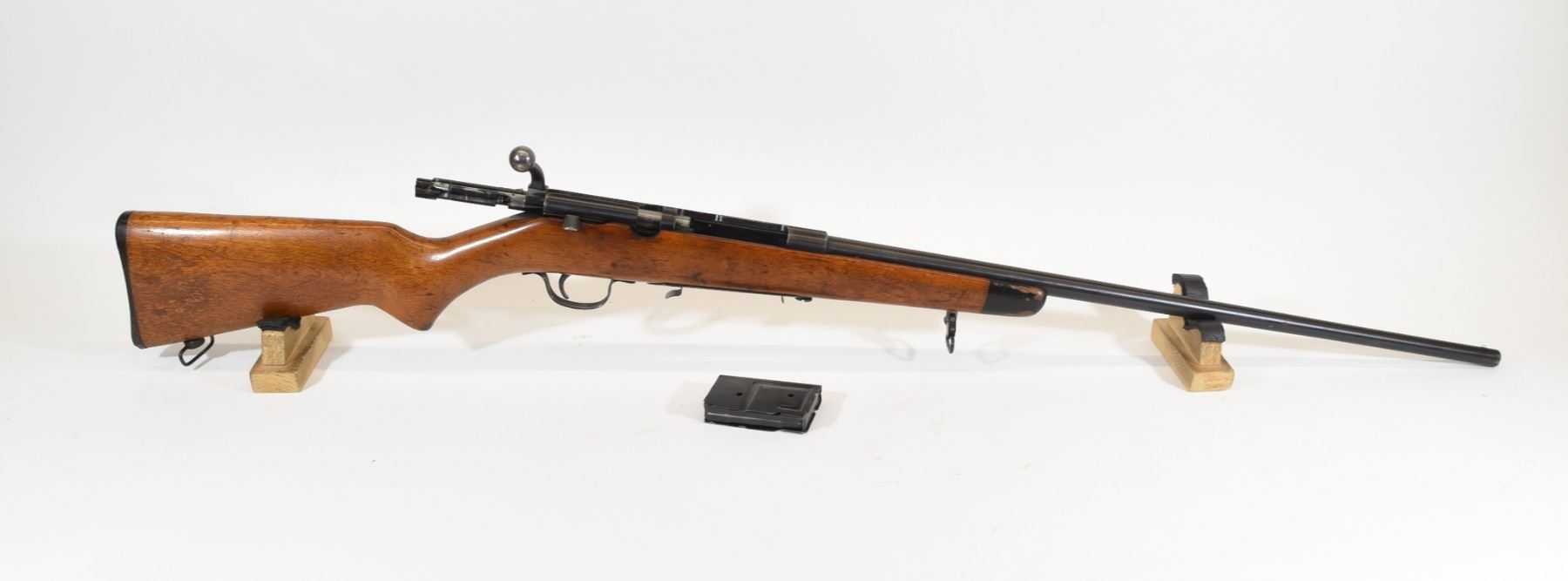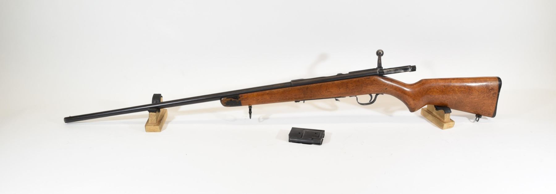 Non-restricted, bolt action, 410 Ga x 3", 24" barrel with fixed full choke, SN none. Wood has some dents, finish is lifting, bluing is grey with a few marks, bore excellent.