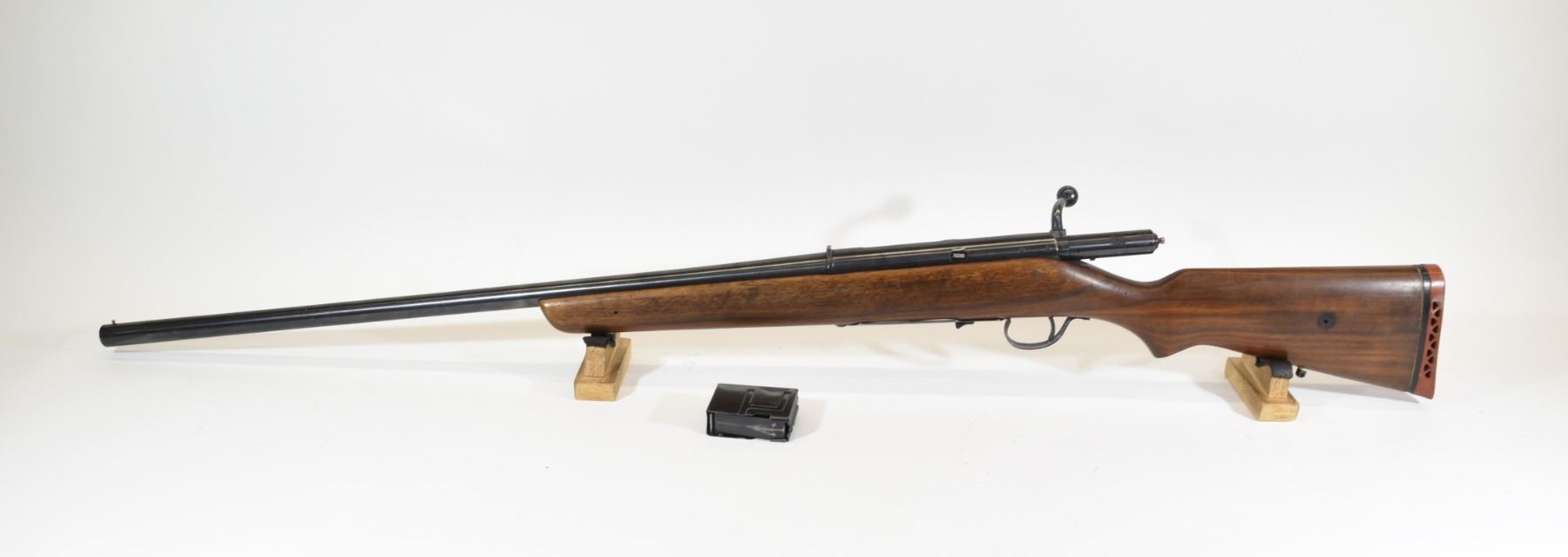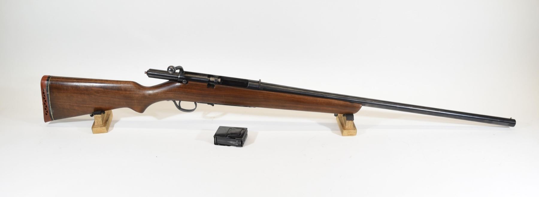 Non-restricted, bolt action, 12 Ga x 2 3/4", 28" barrel with fixed modified choke, SN 7423800. Wood has some dents and two holes drilled in left side, bluing has a few marks and scratches, small dent in barrel, bore very good.