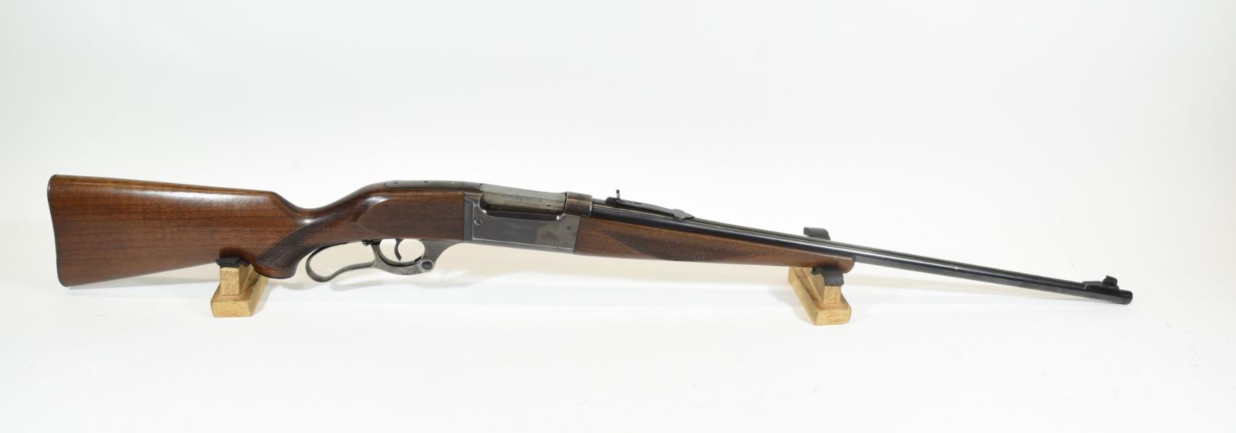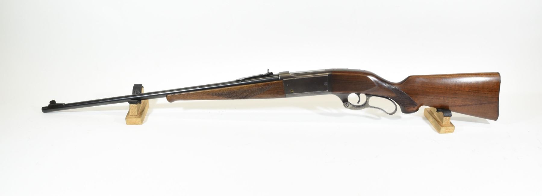 Non-restricted, lever action, 300 Savage, 24" barrel, SN 570754. Wood has marks on forearm, bluing grey on receiver and a few marks on barrel, bore very good.