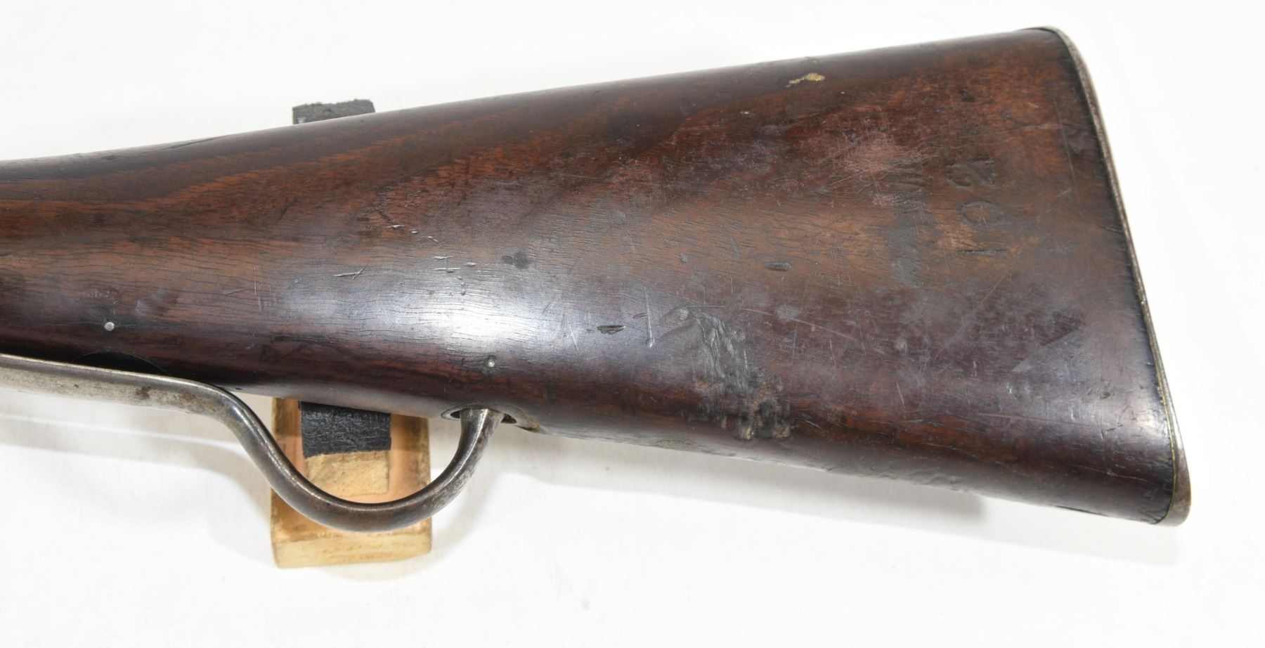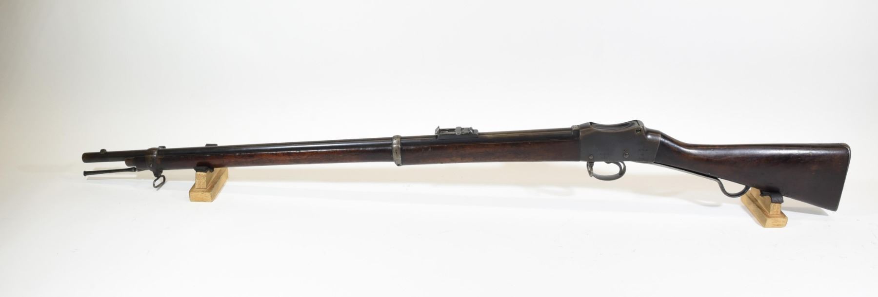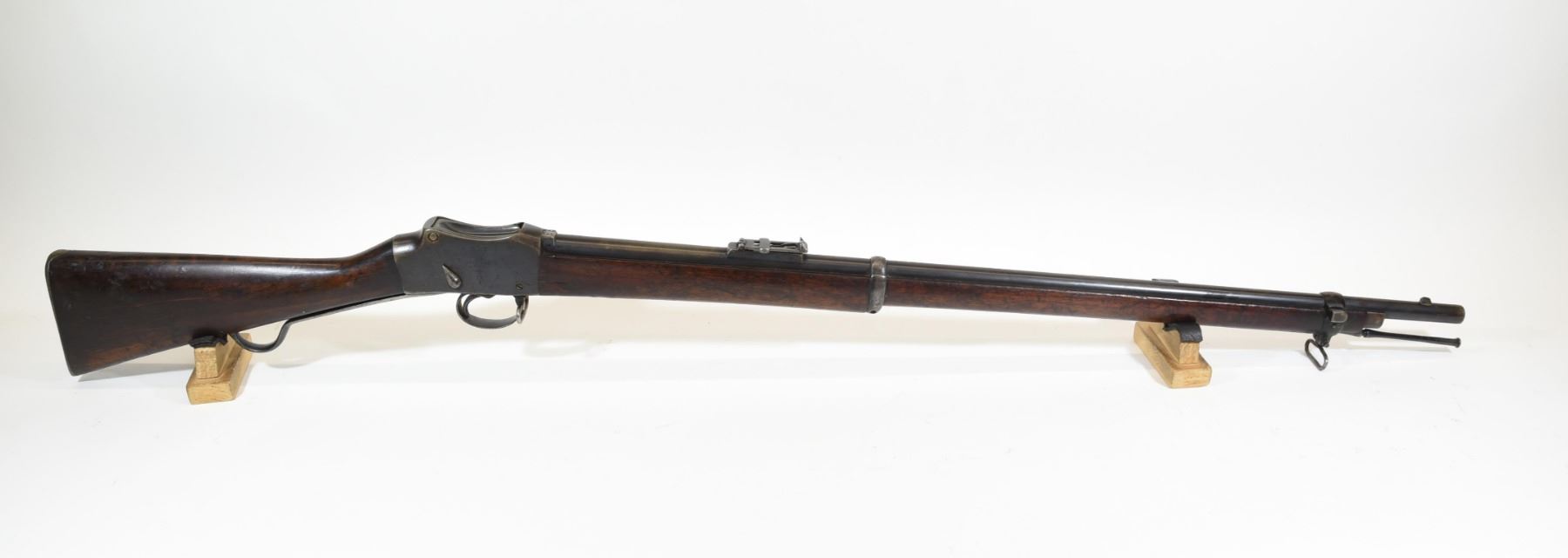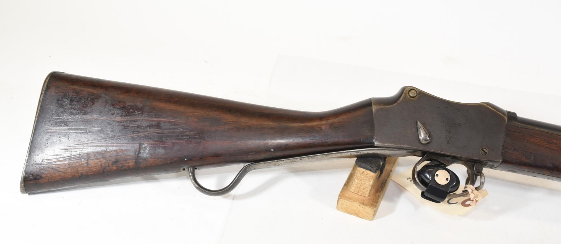 Antique, single shot, 577/ 450 Martini Henry, 33" barrel, SN 3374. Wood has numerous dents, gouges and marks with a couple cracks, bluing is brown, bore dark from corrosive ammo, rifling prominent. No bayonet.