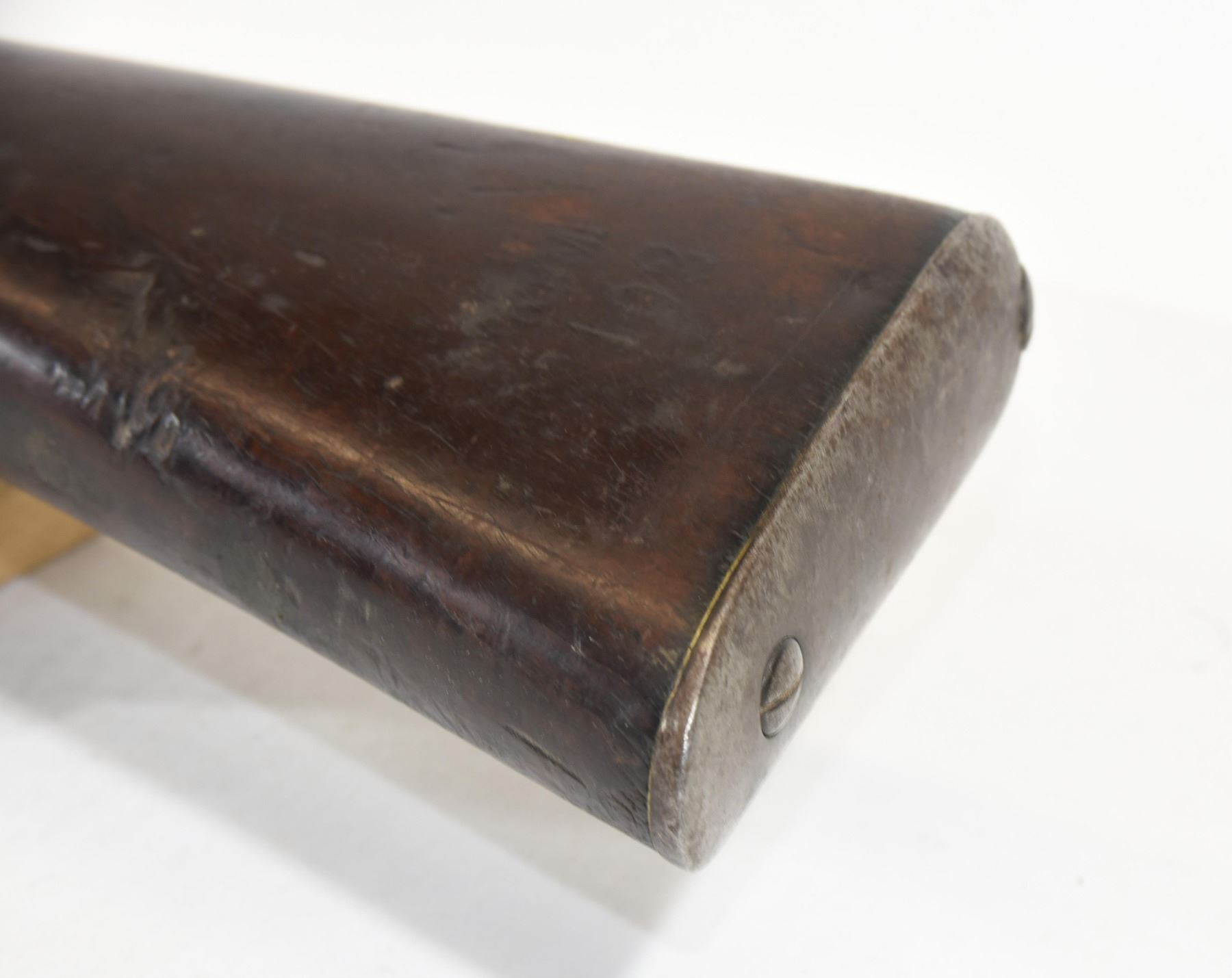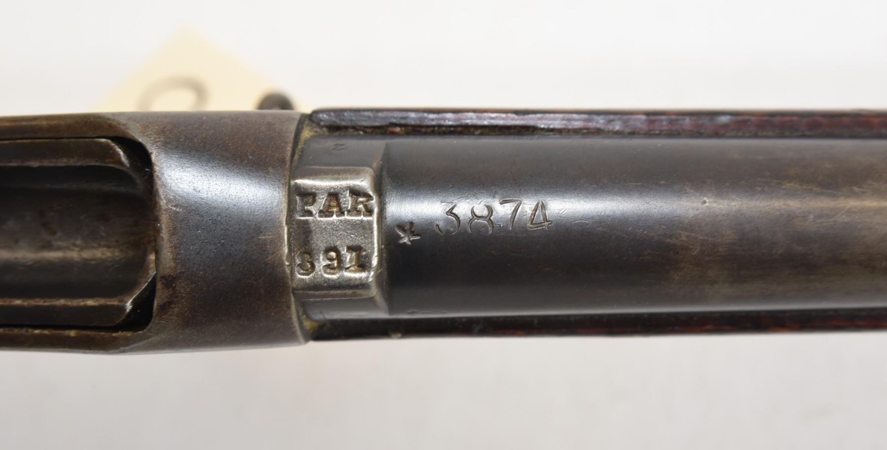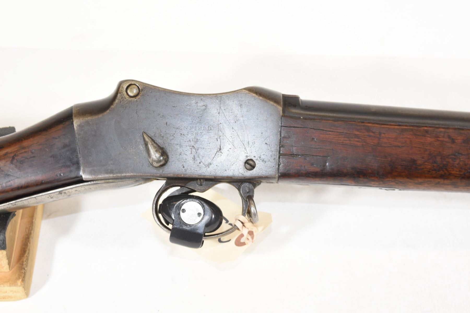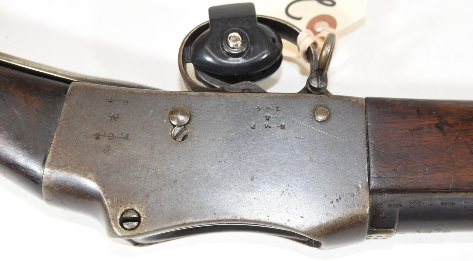 Antique, single shot, 577/ 450 Martini Henry, 33" barrel, SN 3374. Wood has numerous dents, gouges and marks with a couple cracks, bluing is brown, bore dark from corrosive ammo, rifling prominent. No bayonet.