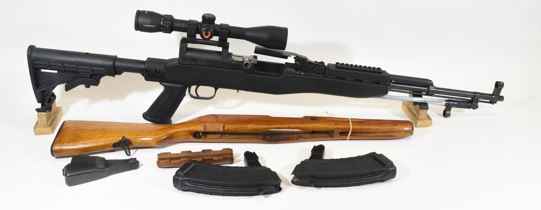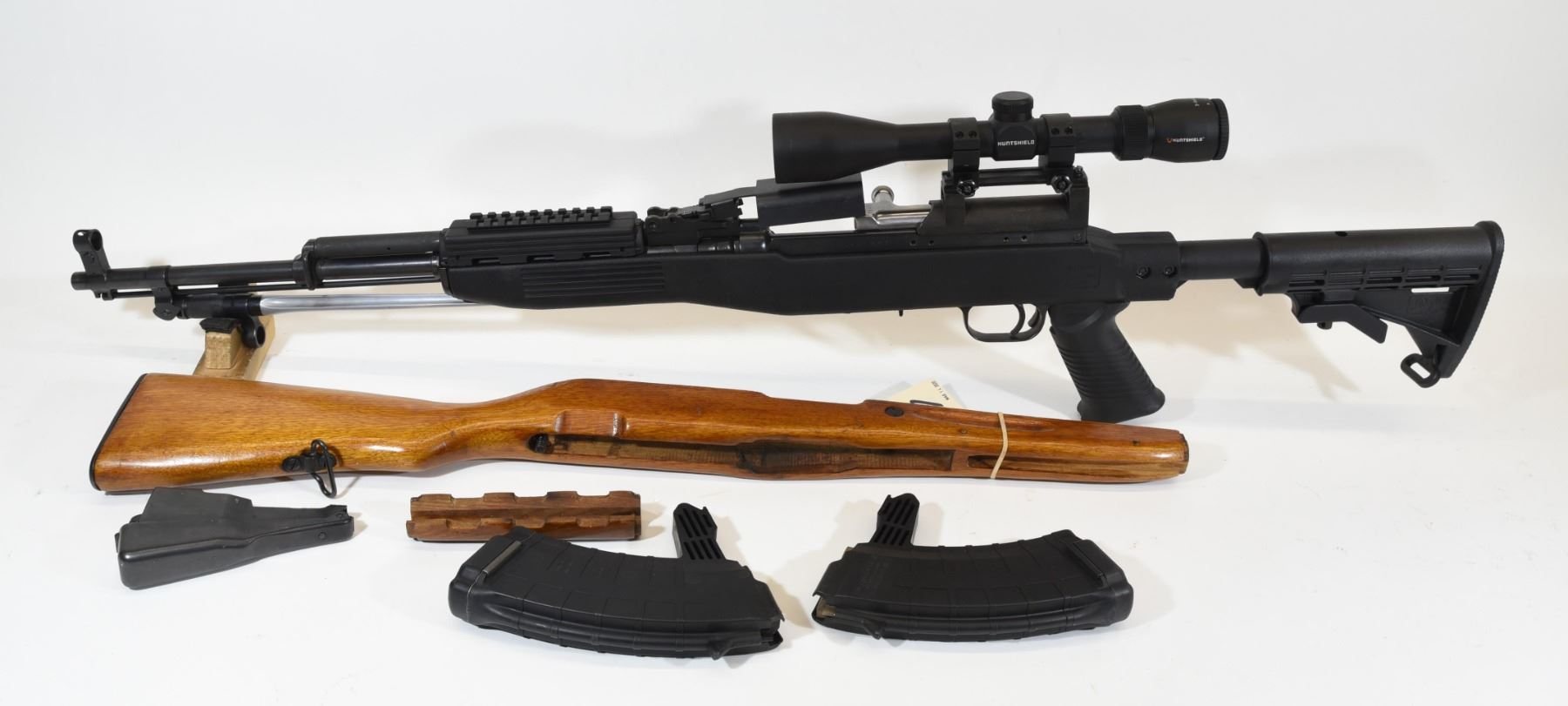 Non-restricted, semi-auto, 7.62 x 39, 20" barrel, SN 1514336. Synthetic Tapco stock very good, bluing is faded, bore very good. Comes with Huntshield 3-9 x 40 scope, two 5 round magazines, brass deflector, original wood stock and mag well. New gas tube and piston Jan/20.
