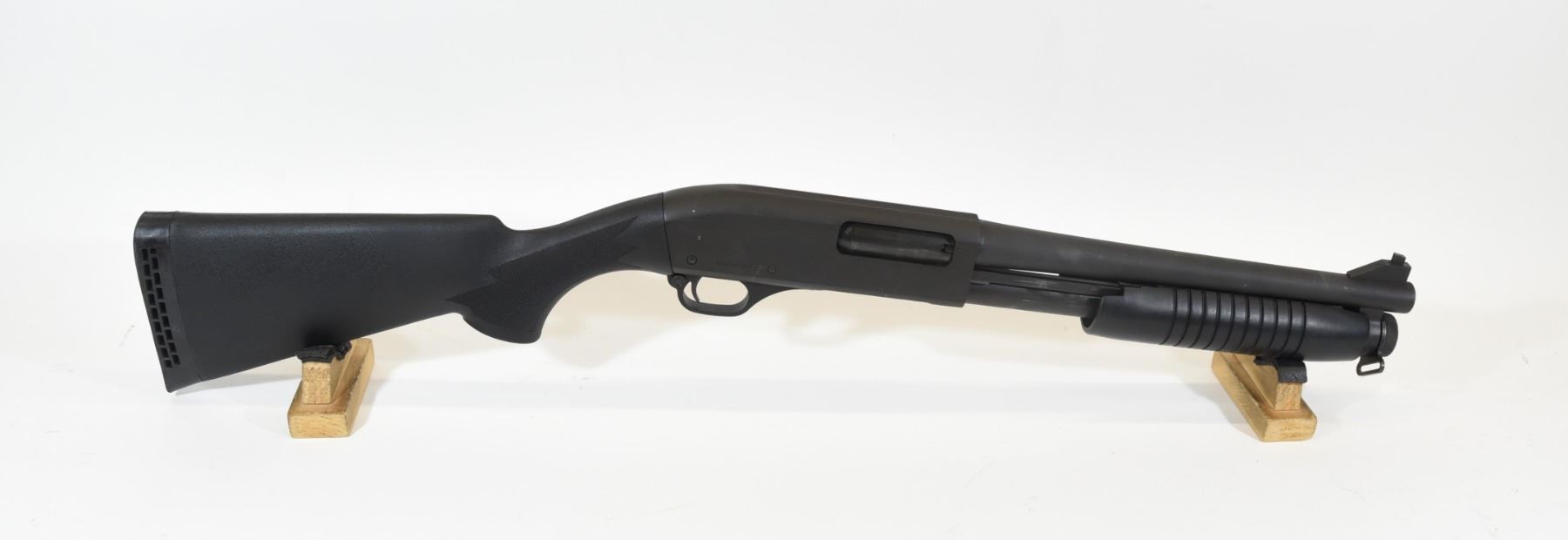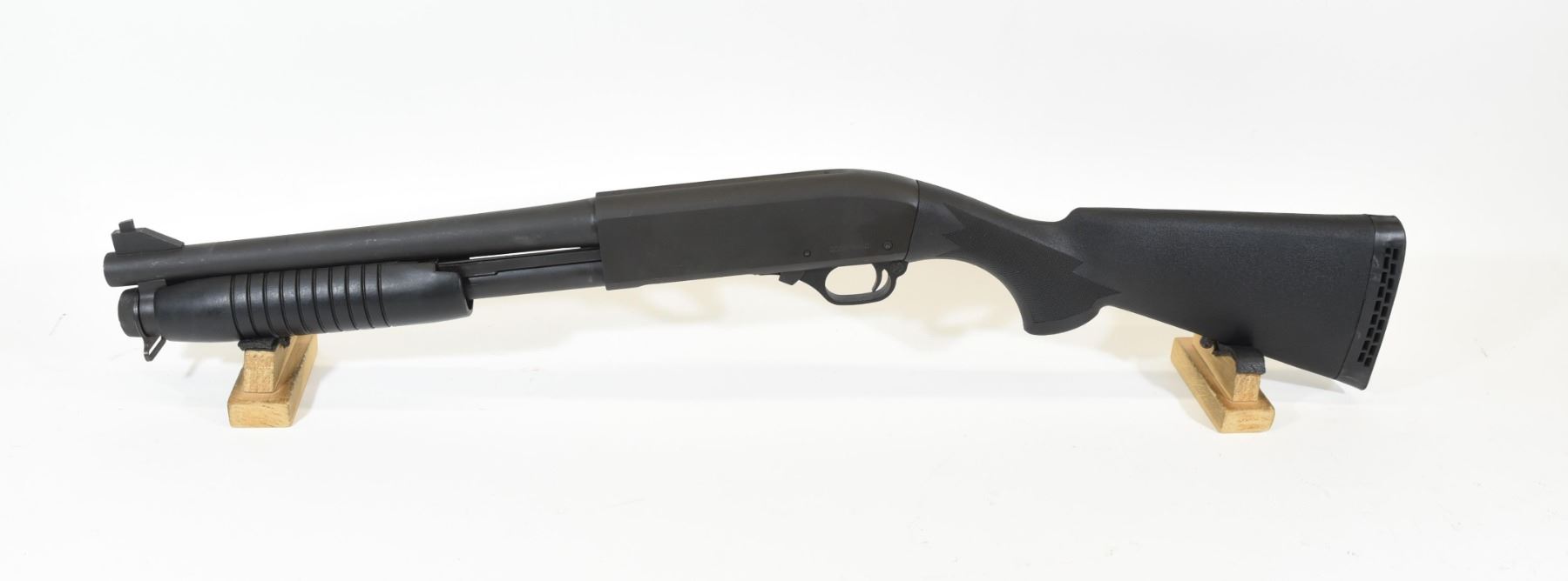 Non-restricted, pump action, 12 Ga x 3", 12 1/2" barrel with fixed open choke, SN 006295410. Synthetic stock very good, matte metal finish has a few marks and scratches, bore excellent.