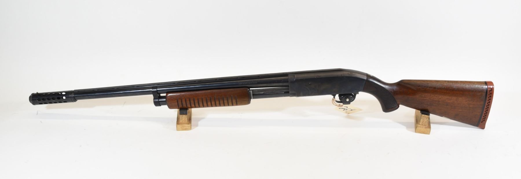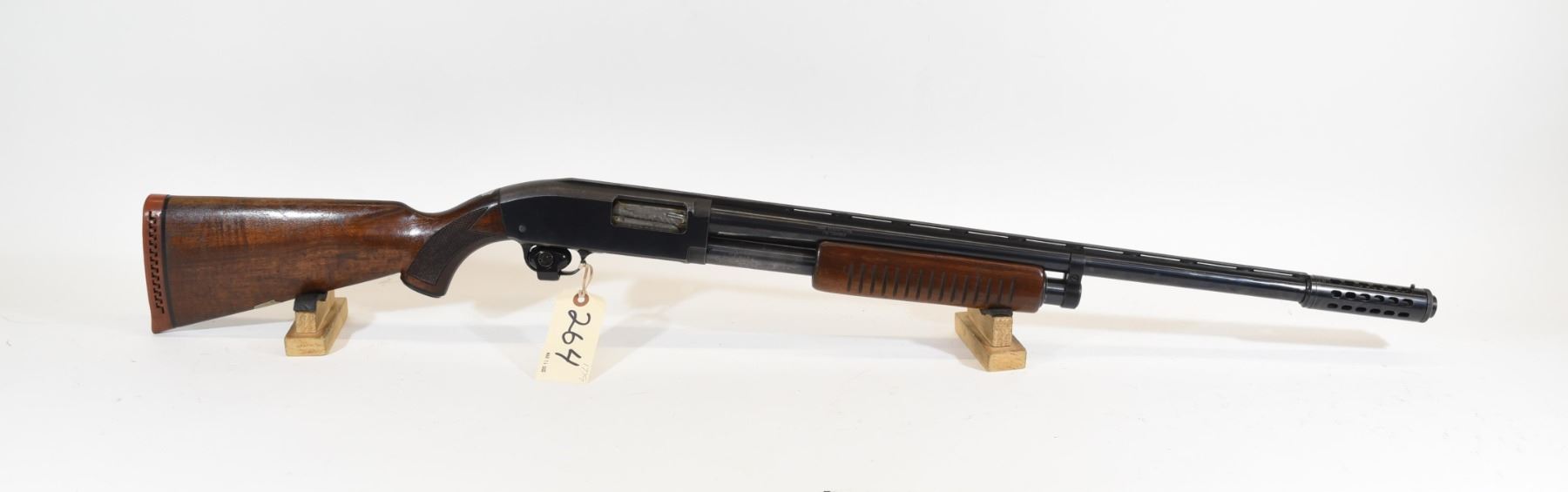 Non-restricted, pump action, 12 Ga x 2 3/4", 27" barrel with compensator, SN none. Woods has numerous small dents and scratches, bluing is turning grey with some pit marks, bore very good.