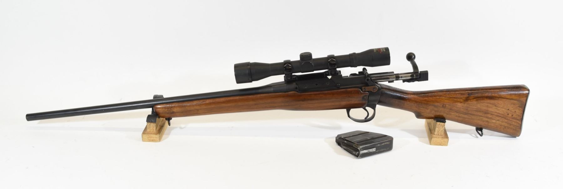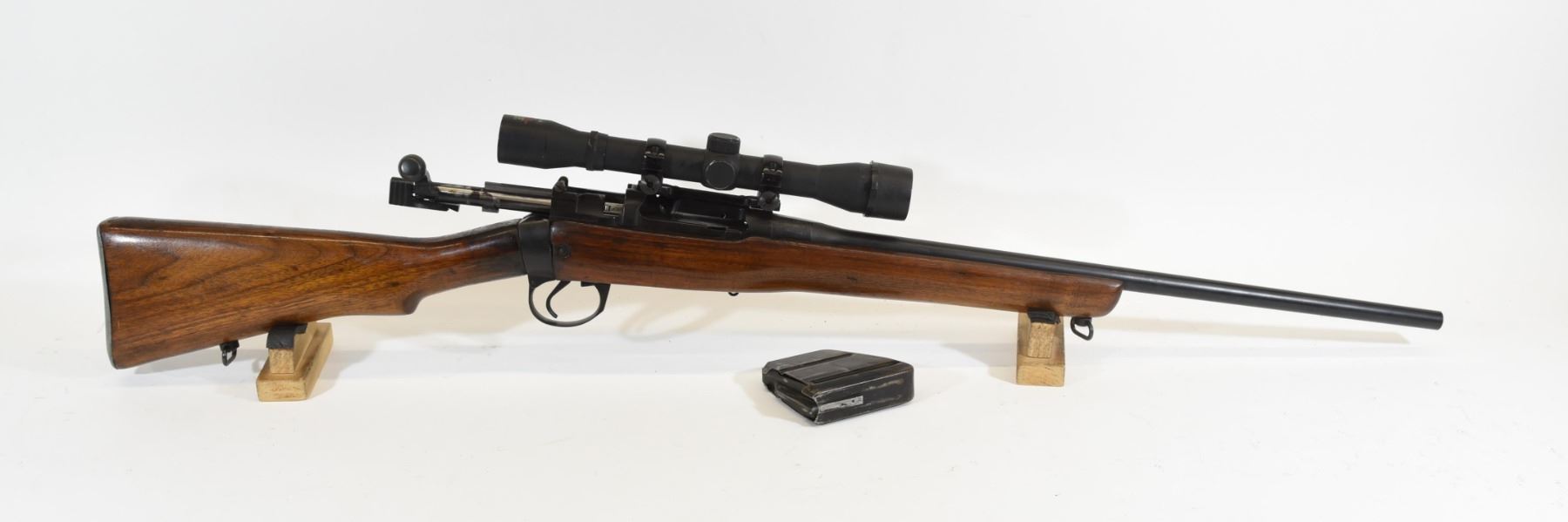 Non-restricted, bolt action, 303 British, 22" barrel, SN 7L9656. Wood has some marks, bluing turning grey, bore excellent. Comes with Tasco 4 x 32 scope.