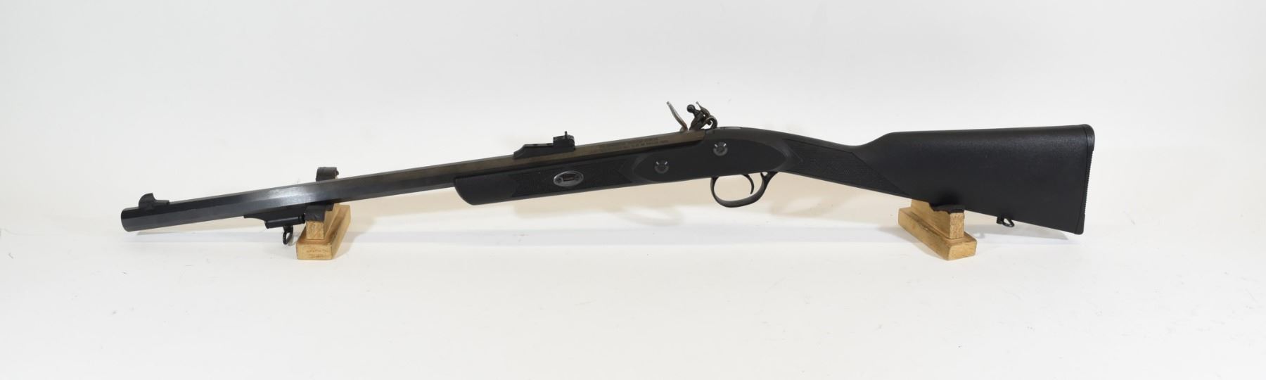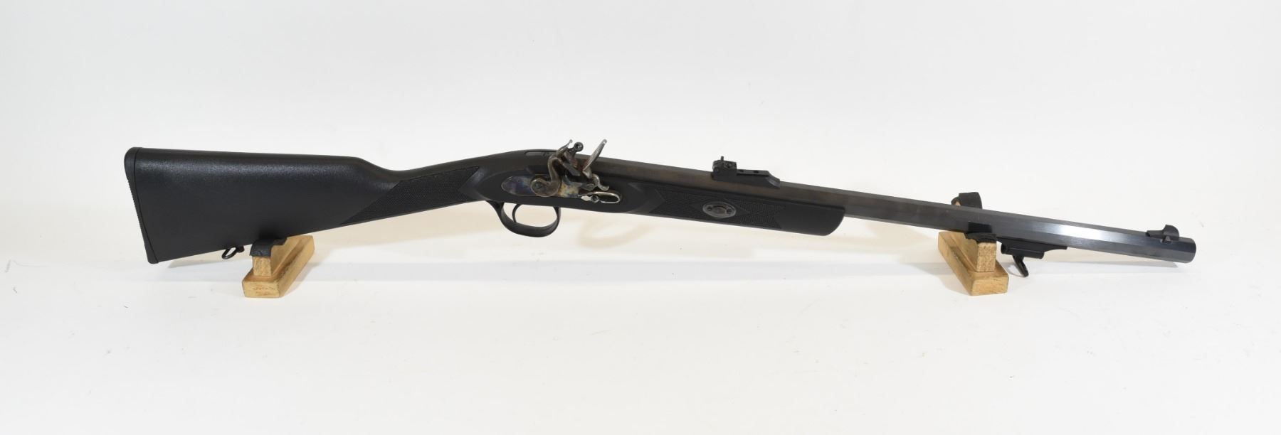 Antique, single shot, 50 flintlock, 23" octagonal barrel, SN 141300726300. Synthetic stock very good, bluing has some pitting at flashpan, bore has pitting. Missing ram rod.