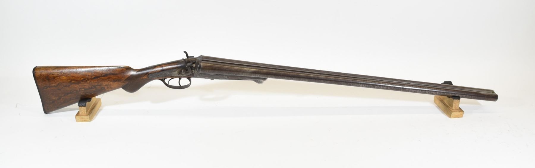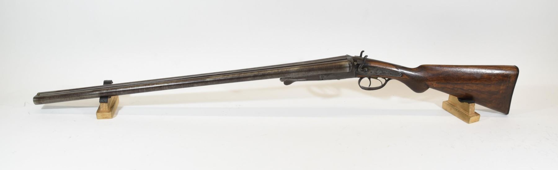 Non-restricted, multi-barrel, 12 Ga, 30" Damascus barrels with fixed open chokes, SN none. Wood checkering worn, bluing turning brown, bores pitted. Hammers cock and triggers fire.
