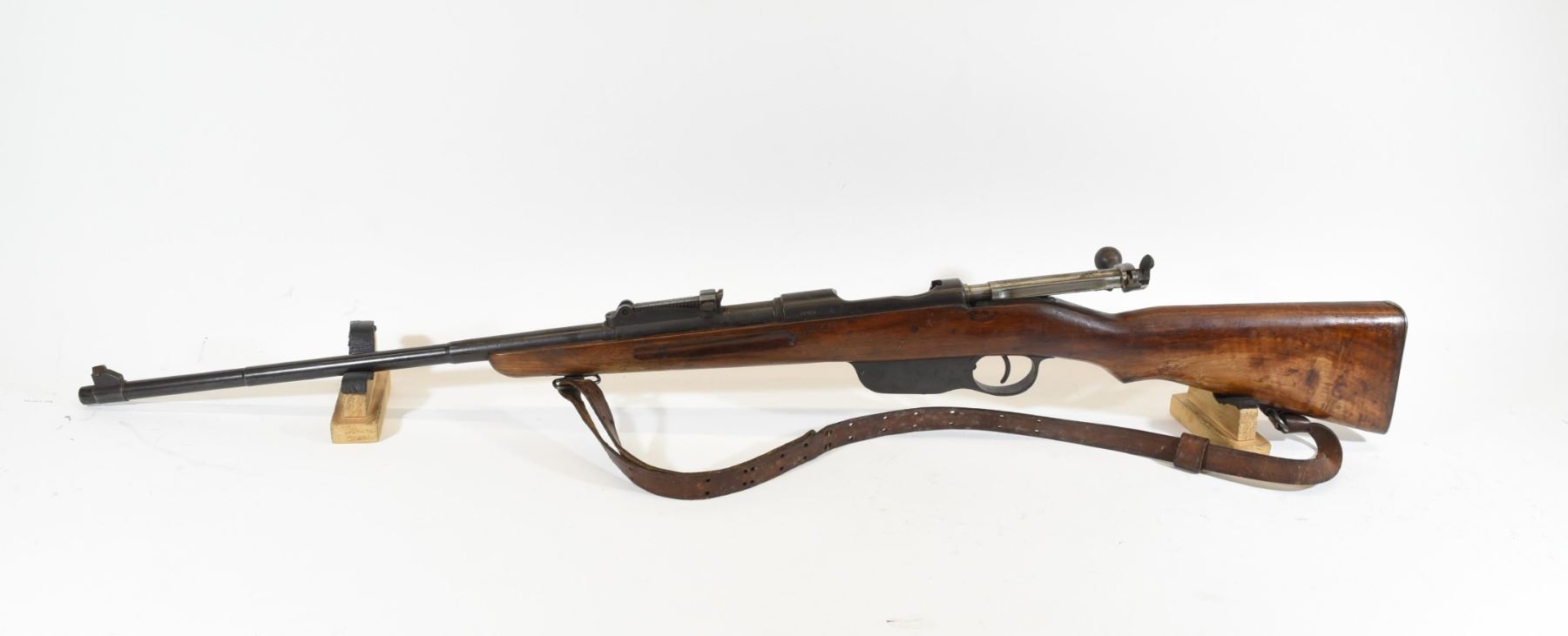 Non-restricted, bolt action, 8mm Mauser, 23 1/2" barrel, SN 89589. Wood has numerous marks, bluing turning brown, bore stained from corrosive ammo, rifling prominent.
