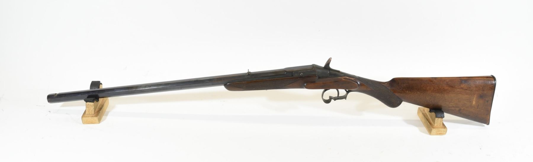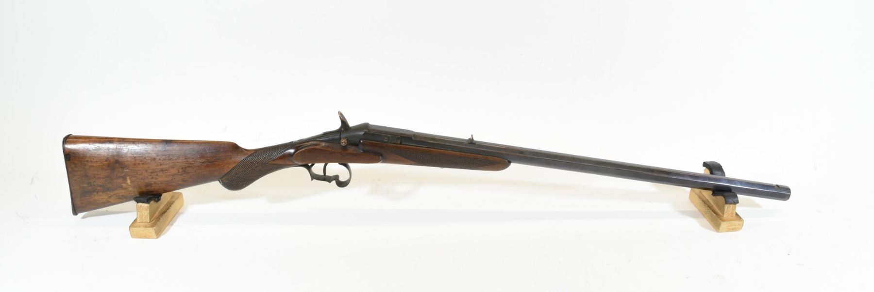 Non-restricted, single shot, 32 rim fire, 24" octagonal barrel, SN none. Wood is cracked on both sides of the receiver and right side of fore arm, bluing is fair, bore is pitted rifling is evident, no front sight, will not stay cocked.