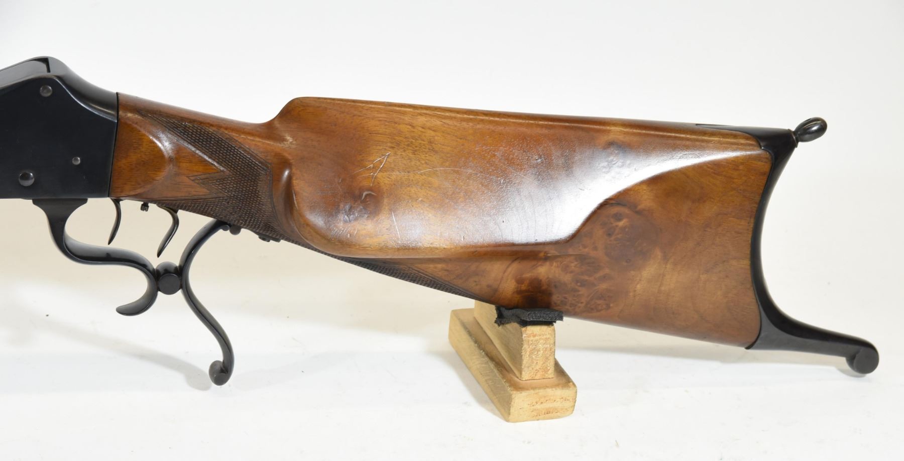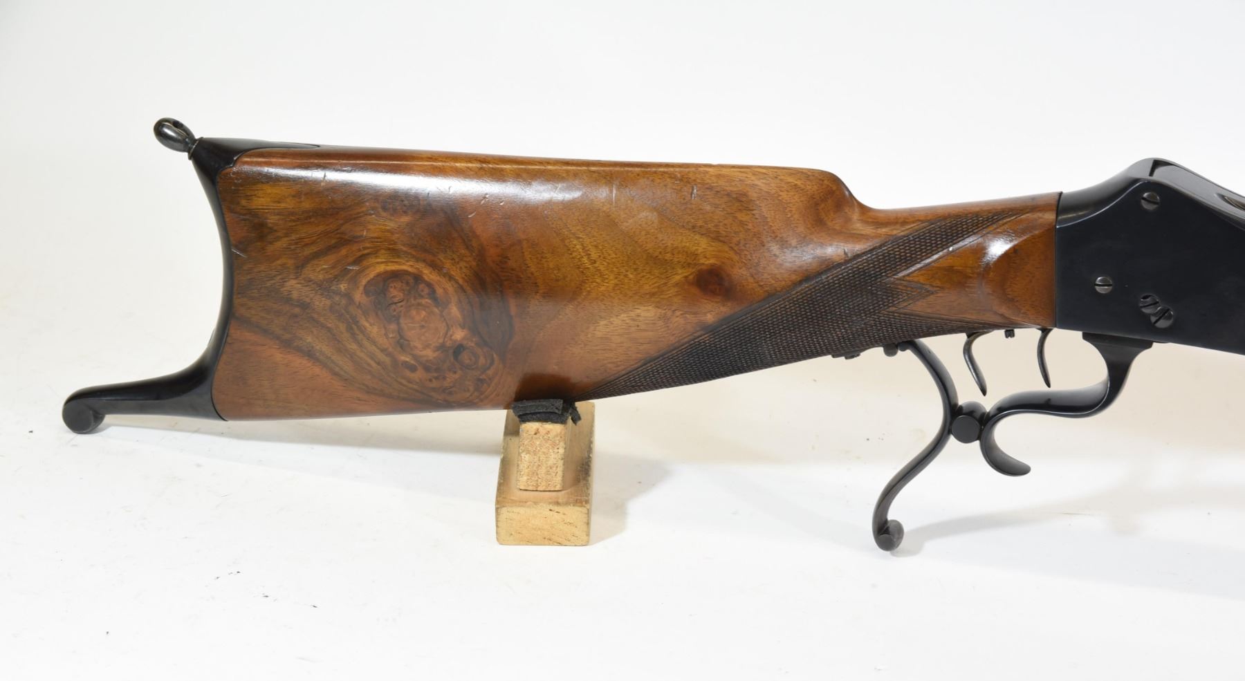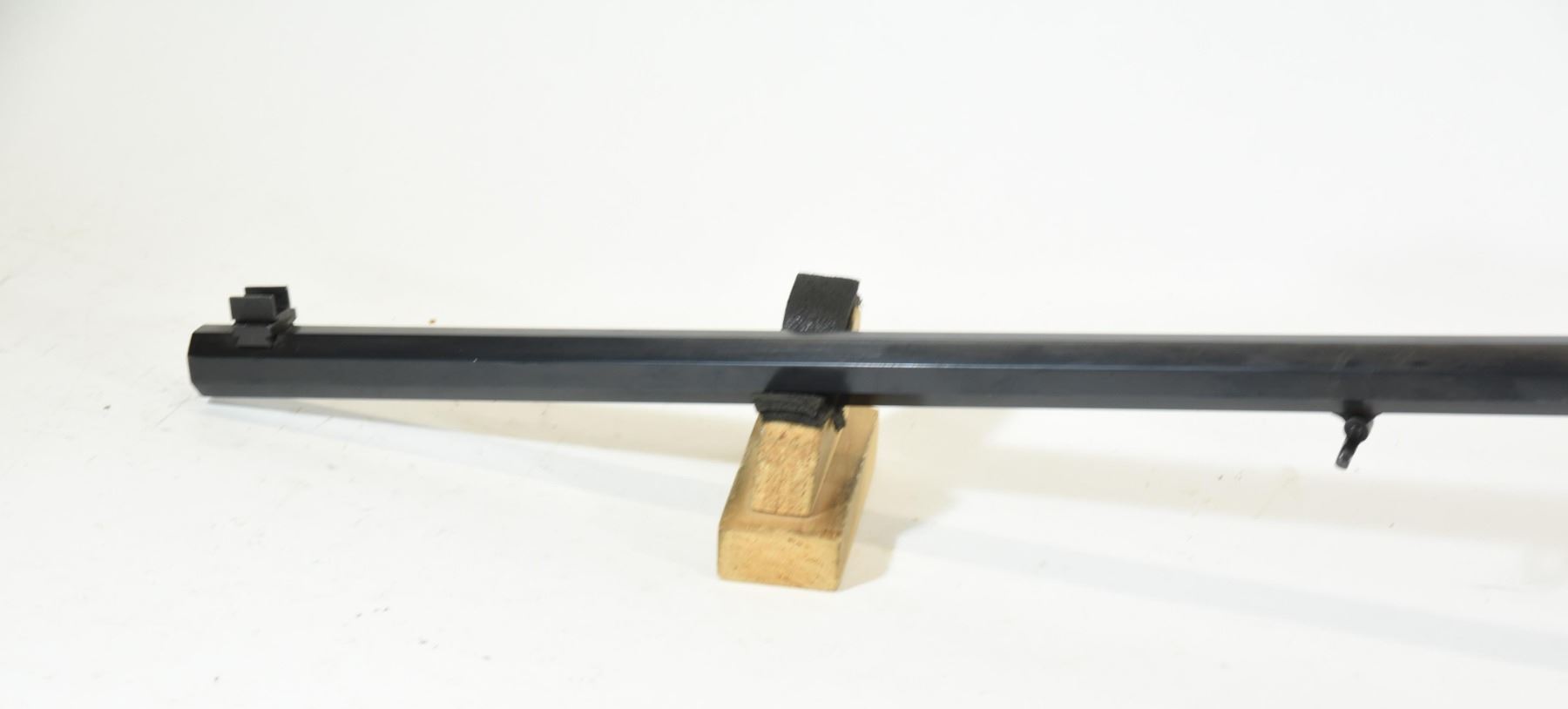 Non-restricted, lever action, 22 cal, 28.5" barrel, SN 3424. Wood has some dents and scratches, bluing is good with light pitting on receiver, bore good.
