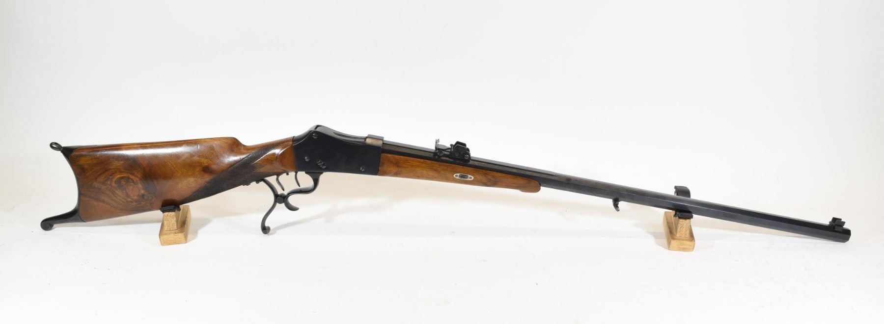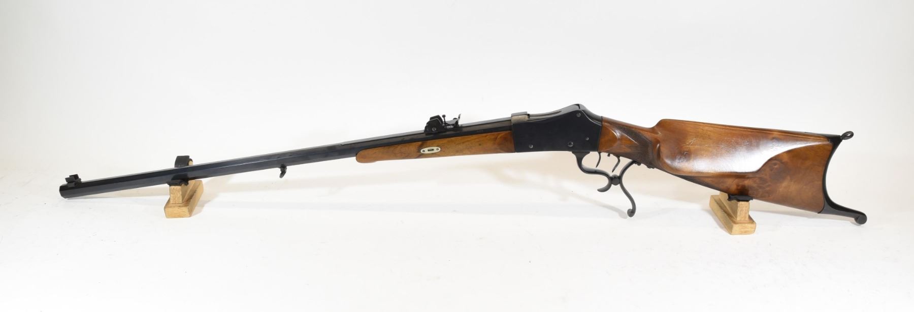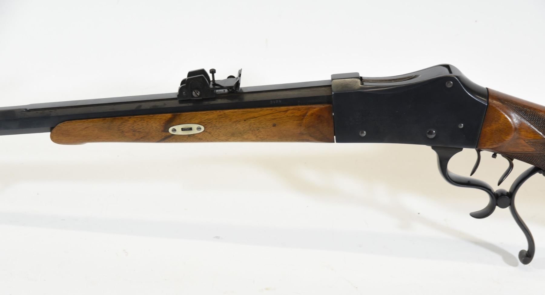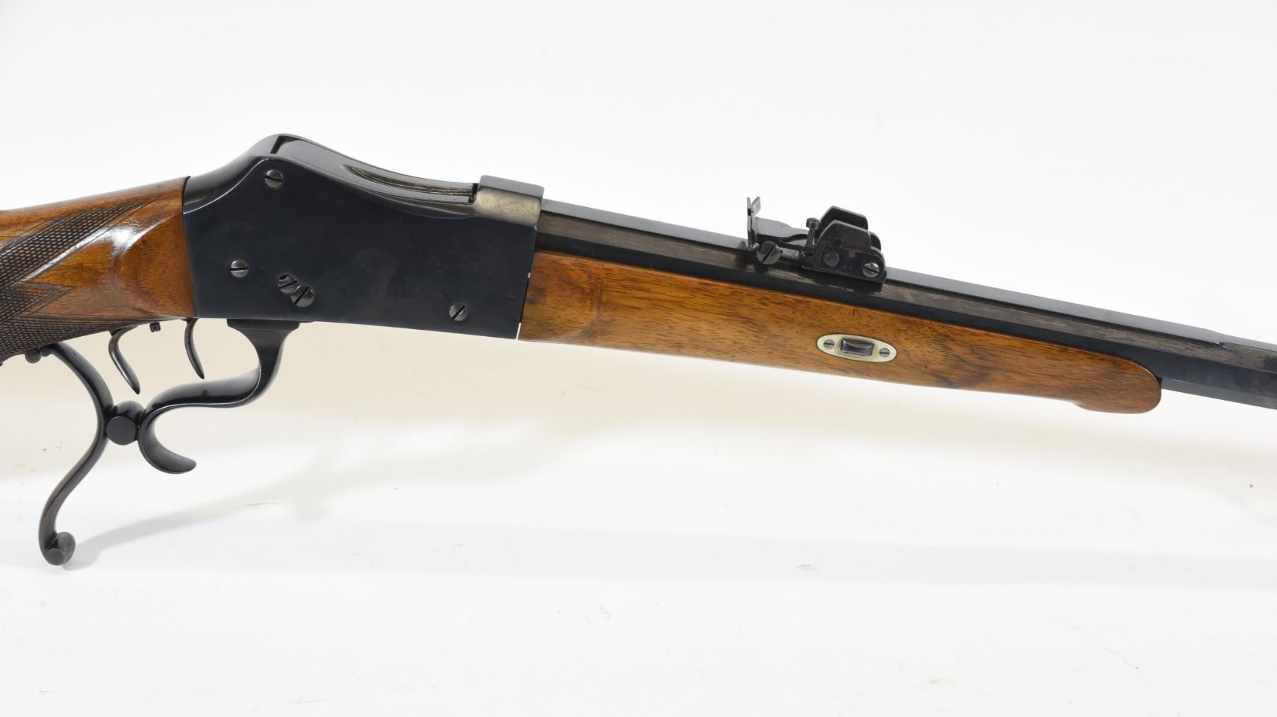 Non-restricted, lever action, 22 cal, 28.5" barrel, SN 3424. Wood has some dents and scratches, bluing is good with light pitting on receiver, bore good.