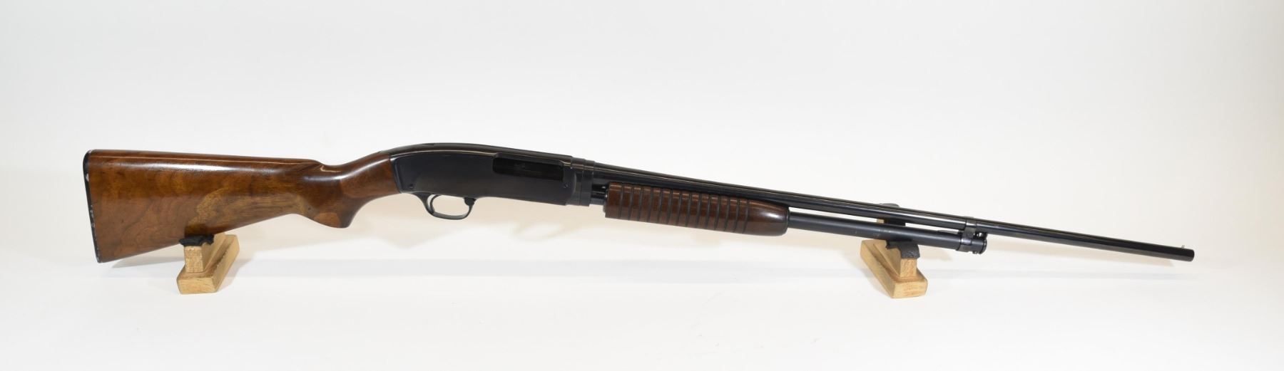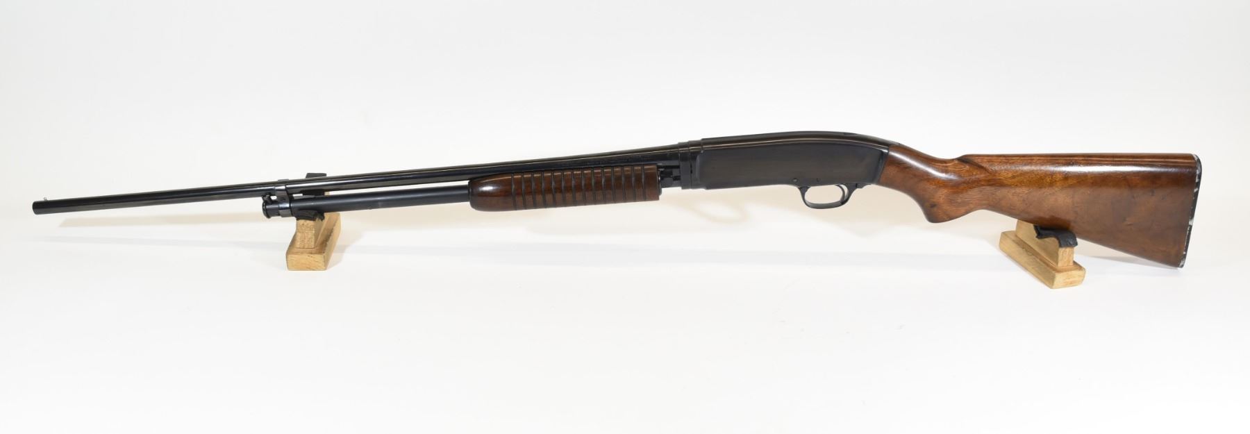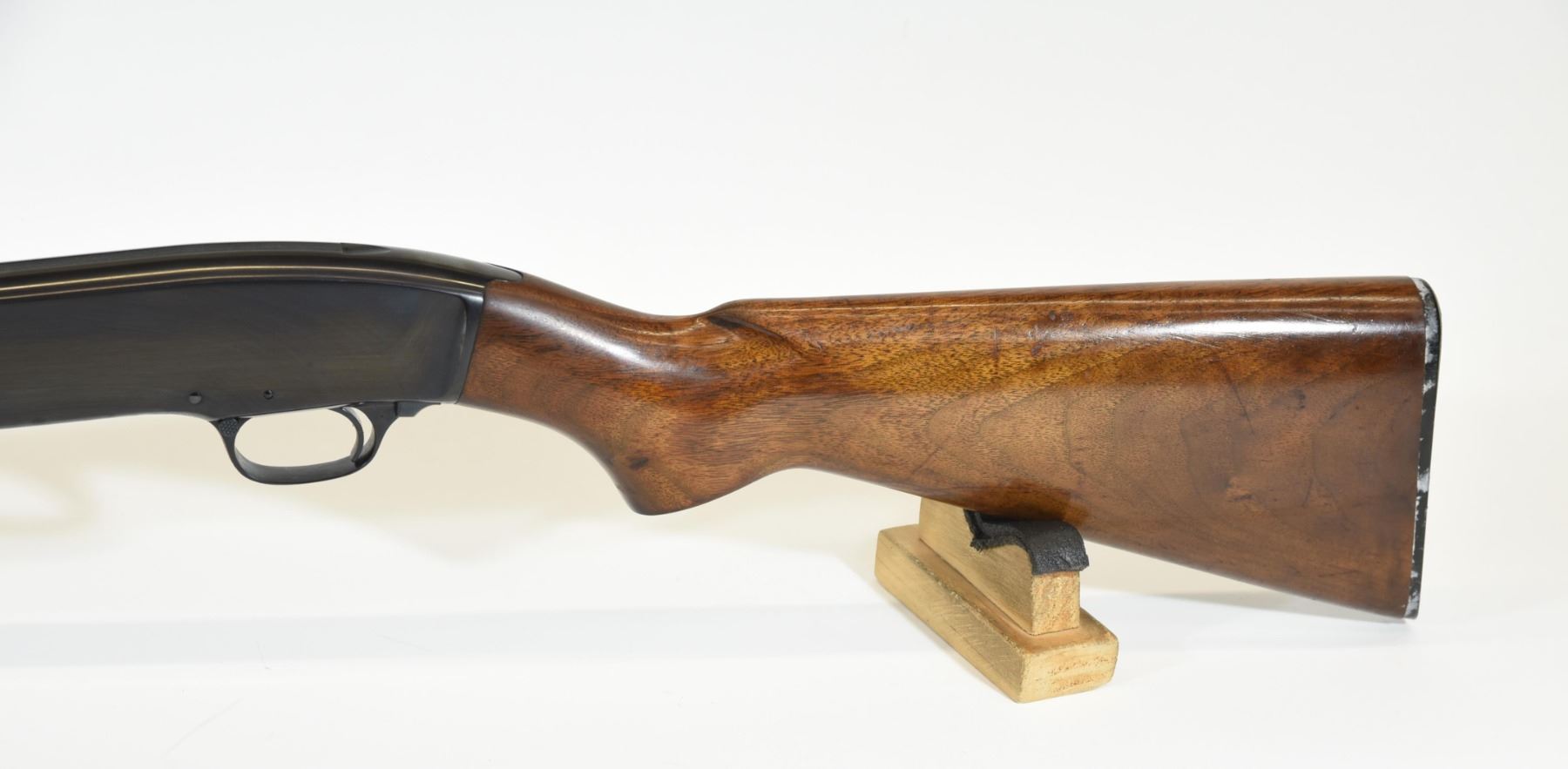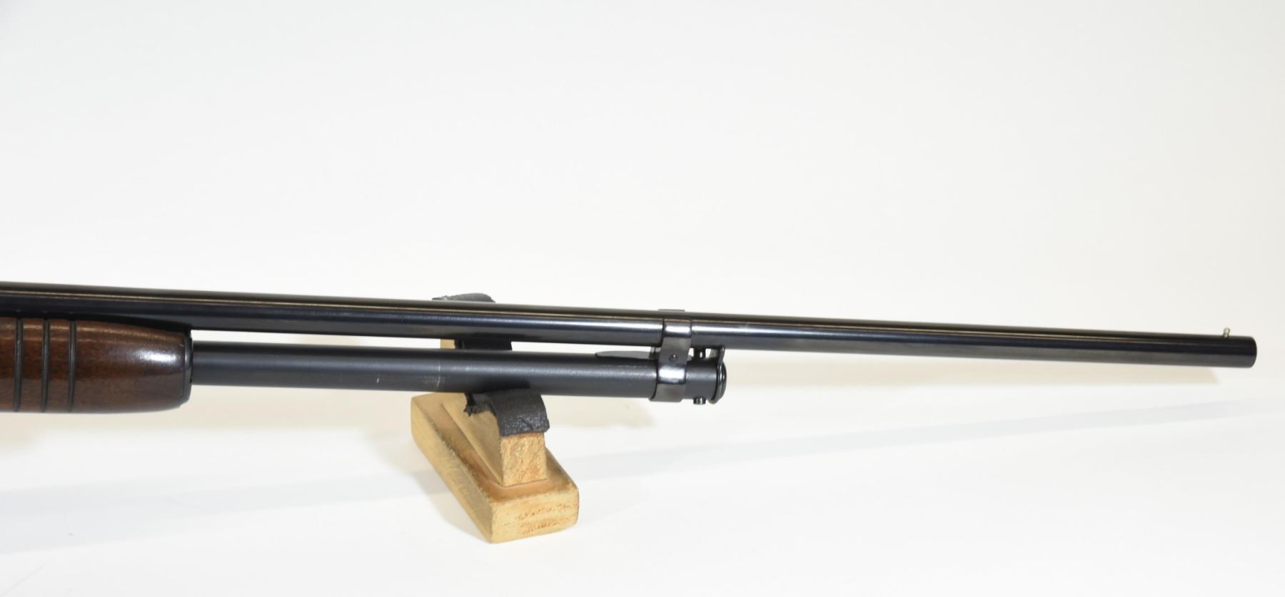 Non-restricted, pump action, 410 Ga x 3", 26" barrel with fixed modified choke, SN 145143. Wood has a few marks, bluing has some light pitting, bore excellent.