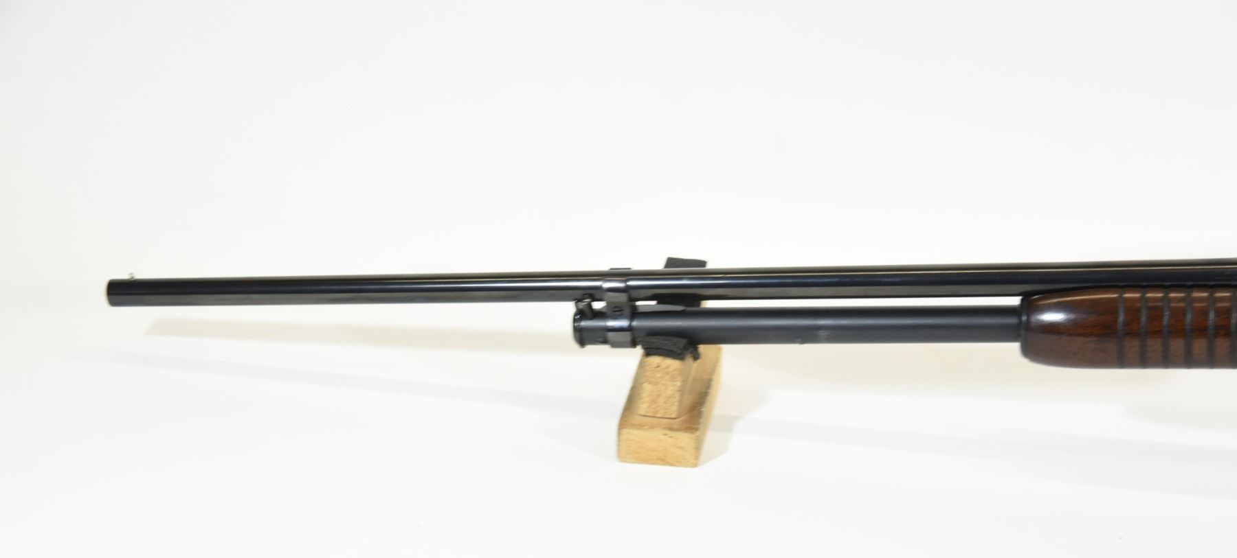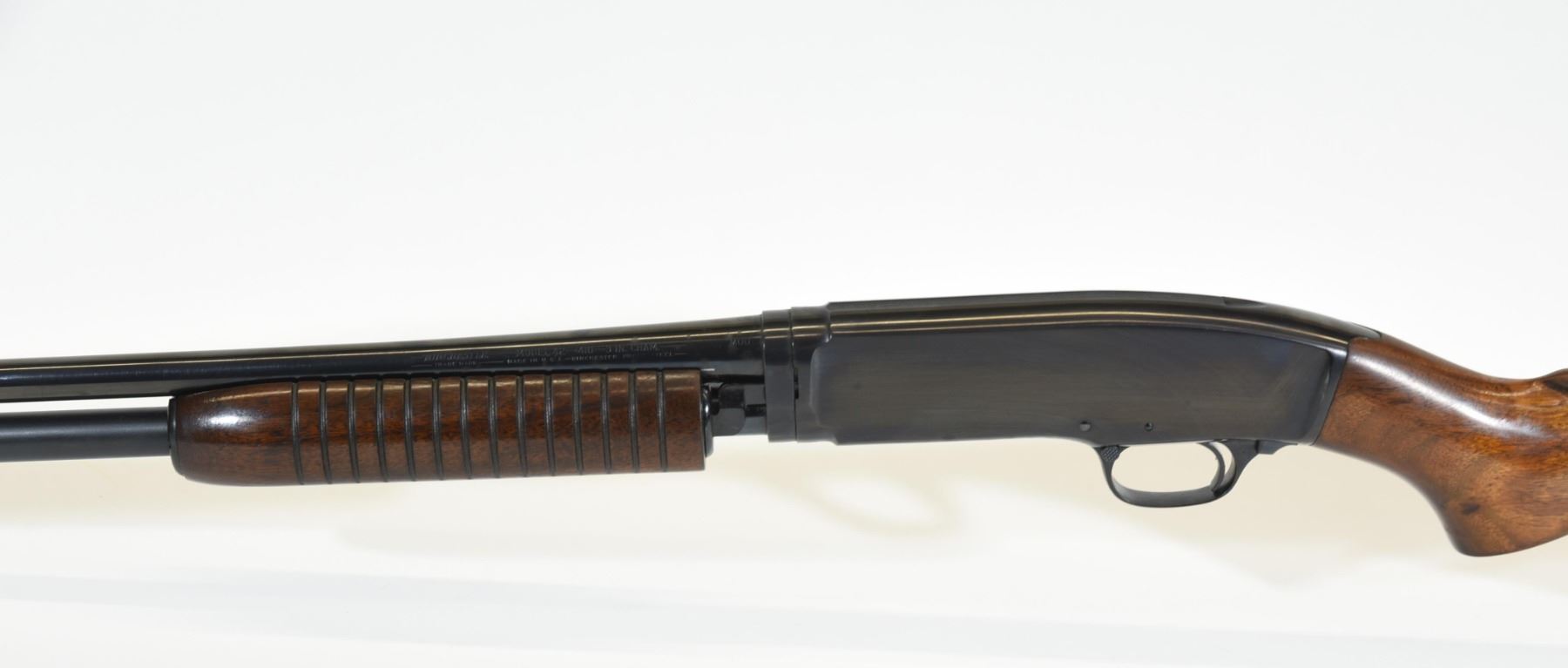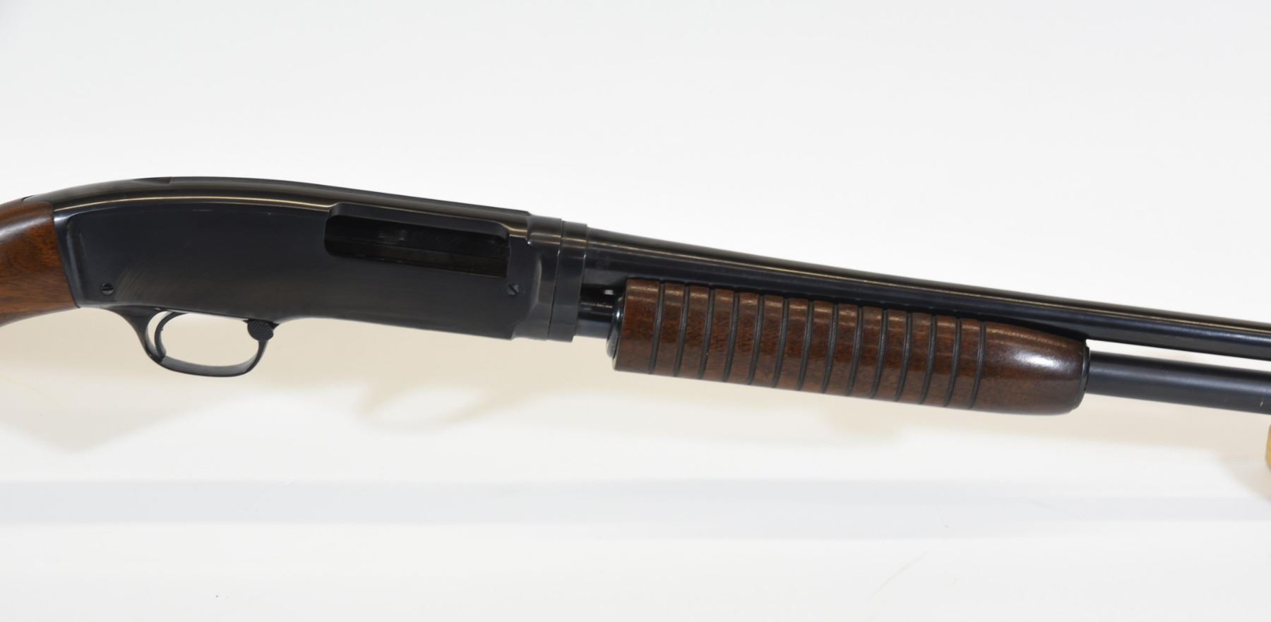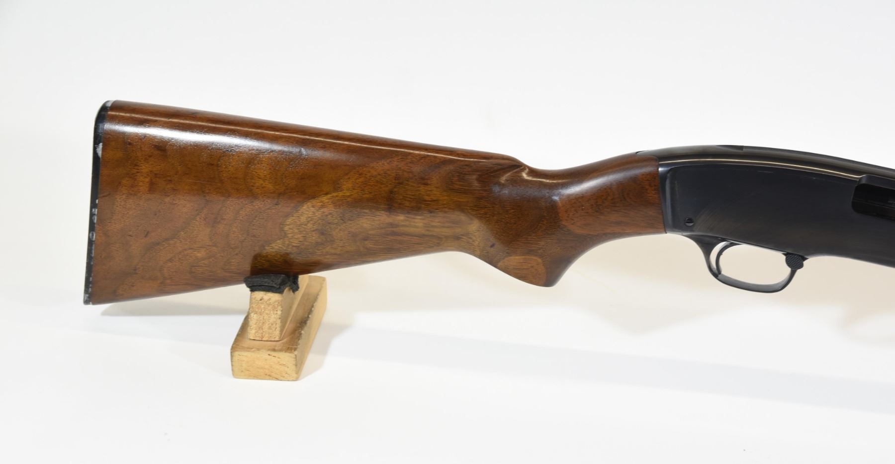 Non-restricted, pump action, 410 Ga x 3", 26" barrel with fixed modified choke, SN 145143. Wood has a few marks, bluing has some light pitting, bore excellent.