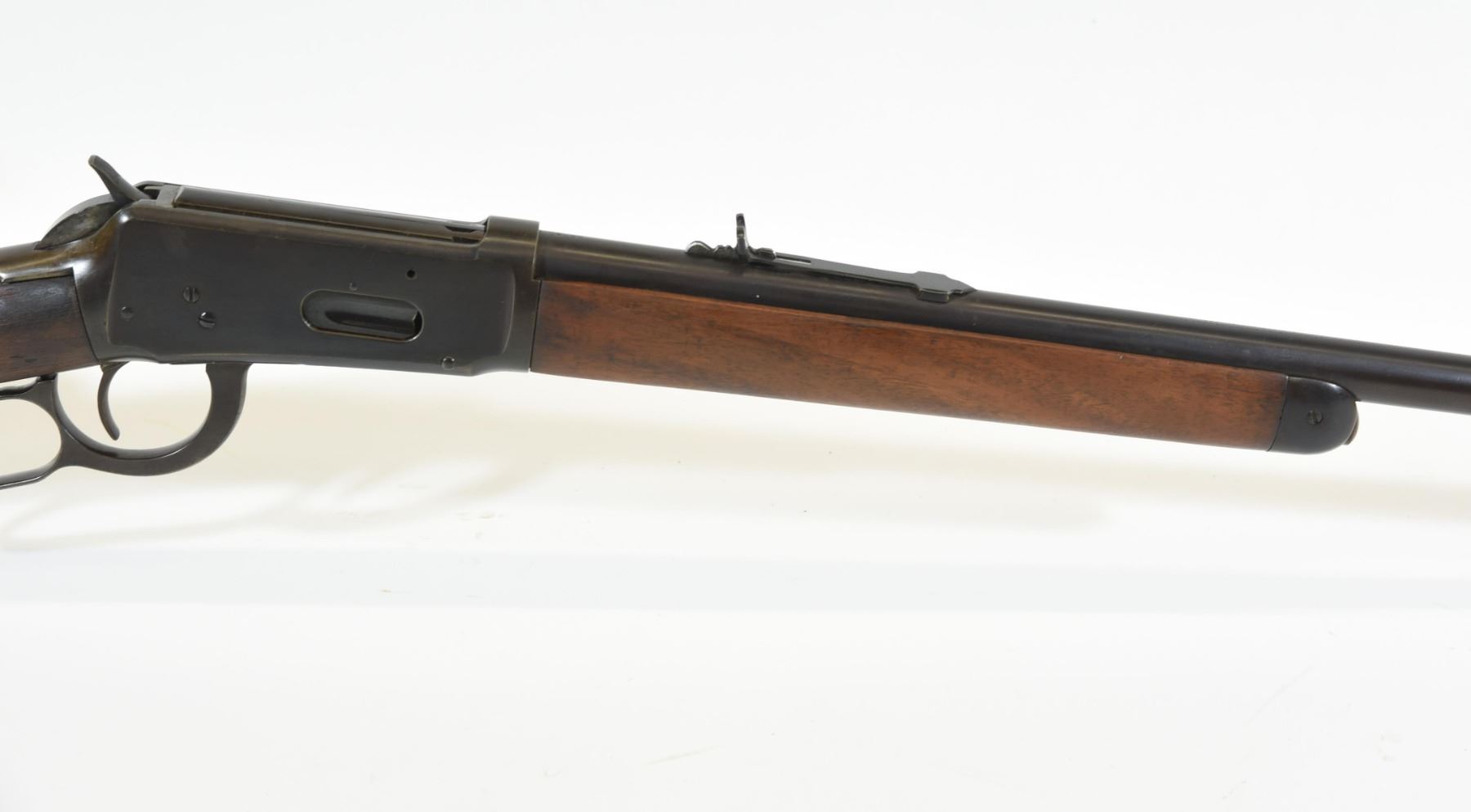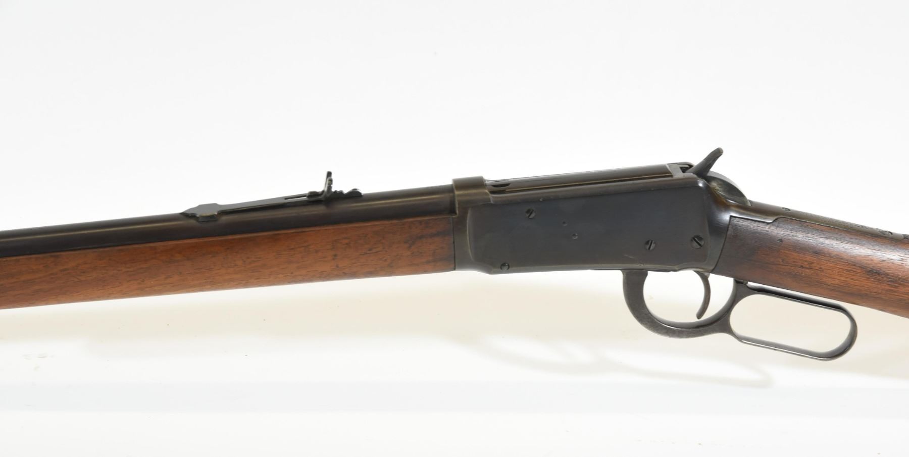 Non-restricted, lever action, 32-40 Win, 26" barrel, SN 263410. Wood has a gouge and has been over sanded, bluing is brown, bore dark from corrosive ammo, rifling evident. Manufactured 1902.